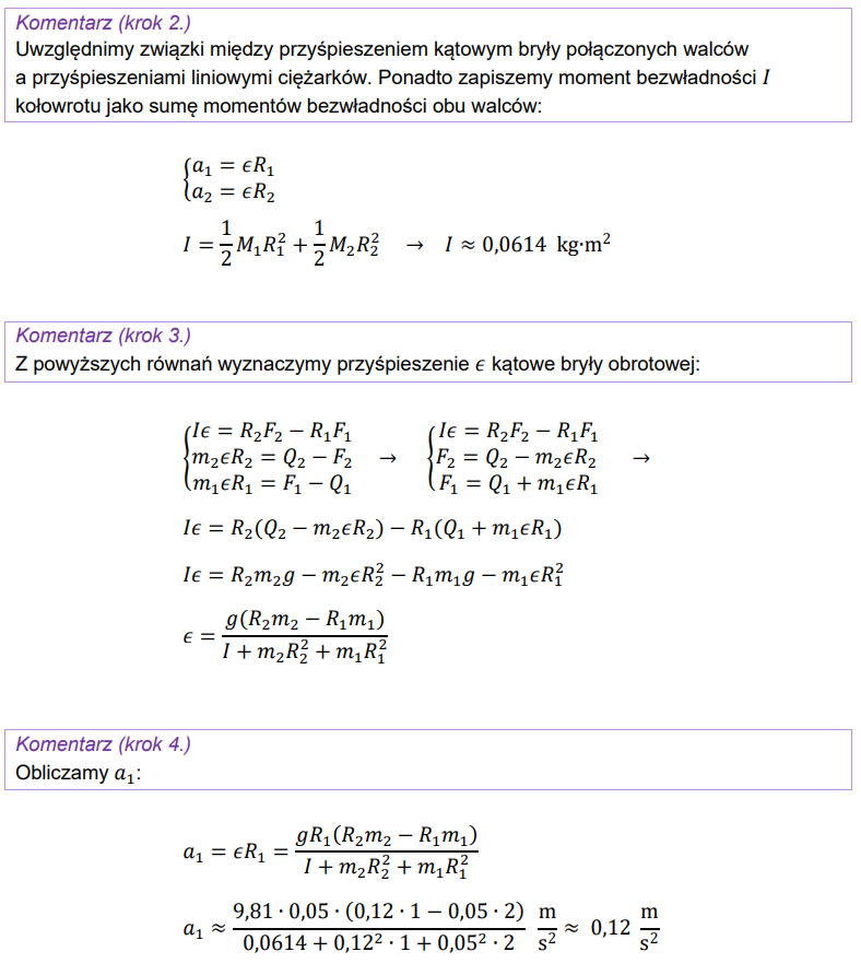 W tym zadaniu jest jeszcze jedno utrudnienie, które trzeba wziąć pod uwagę (przepraszam, że w poprzedniej wiadomości o tym nie wspomniałem, bo mogłem pewnie od razu to napisać), mianowicie z uwagi na fakt, że ciężarki m1 i m2 są nawinięte na różne walce, to ich przyspieszenia mogą być (i będą) różne, więc w pierwszym równaniu będzie a1, a w drugim równaniu a2. Natomiast przyspieszenia kątowe obu walców będą już takie same, czyli epsilon. I tak a1 = epsilon*R1, a a2 = epsilon*R2. Łatwiej będzie więc najpierw wyliczyć epsilon, a potem po prostu a1 - poniżej zamieszczam pełne rozwiązanie podane przez CKE, które dość jasno opisuje ten proces (to zadanie jest dość trudne):