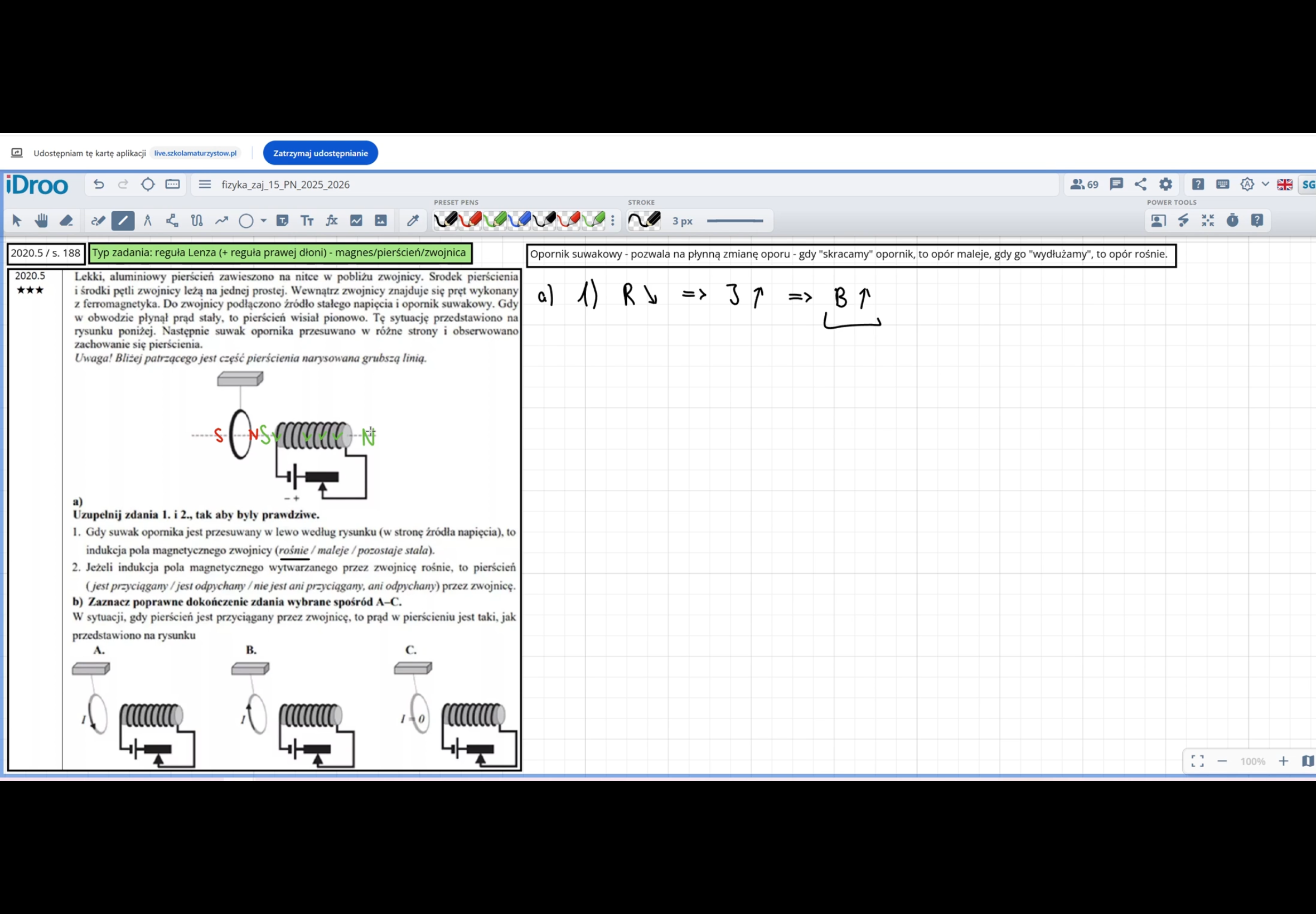Czy w punkcie a) w podpunkcie 2) chodzi o to że według reguły lenza efekt ma przeciwstawiać się przyczynie i przez to że gdy zmieniamy opór tutaj zmniejszamy i zwiększa się natężenie prądu płynącego przez zwoje to wtedy wytwarza się pole magnetyczne wokół zwojnicy a ta obręcz ma się jemu opierać dlatego tam będzie S po prawej i N po lewej żeby była odpychana przez zwojnice?