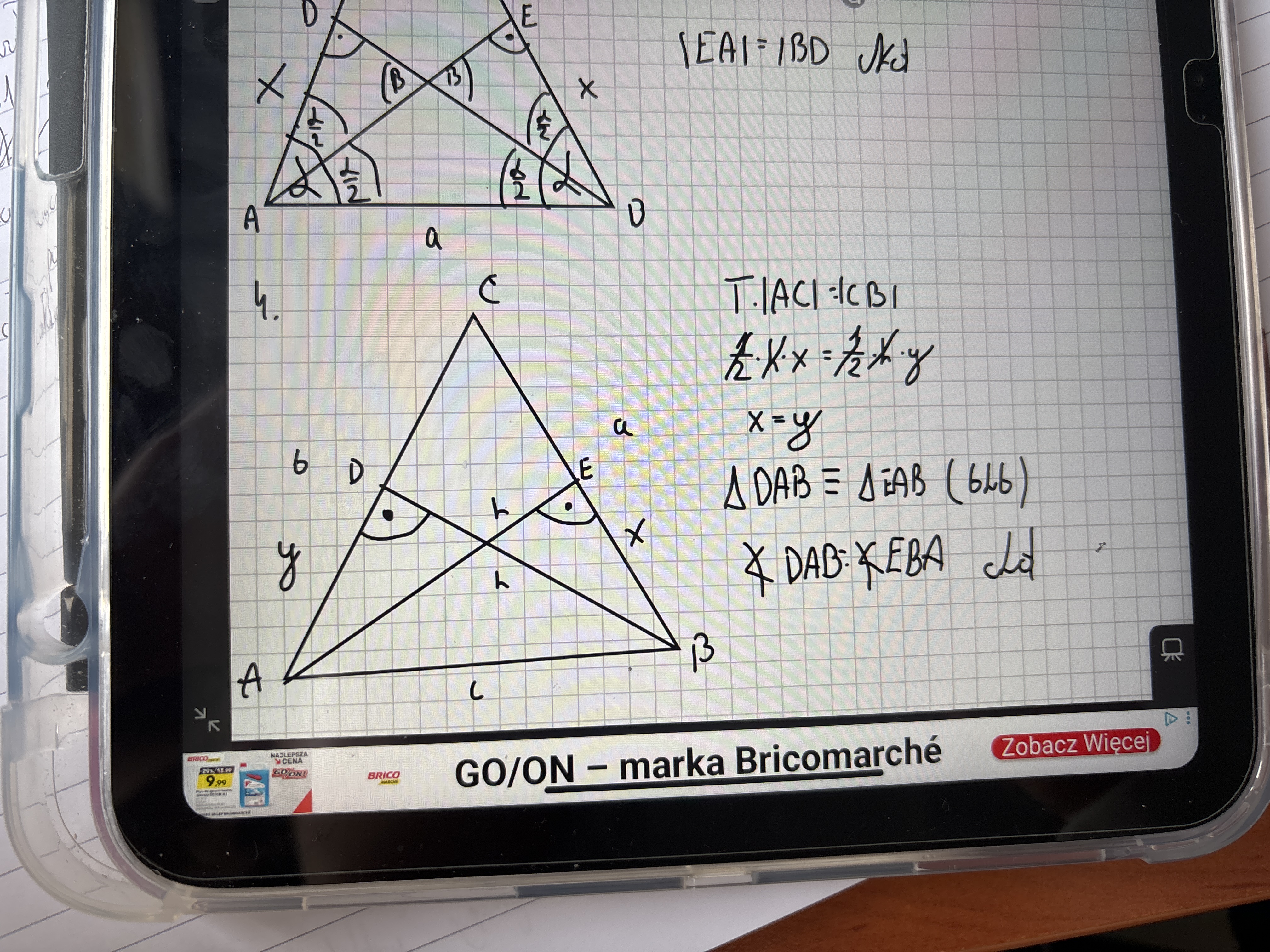 Zadanie nie jest poprawnie rozwiązane, zauważ, że kryterium BKB, działa jeśli kąt POMIĘDZY bokami jest ten sam, a ty zastosowałaś boki długości l, x, oraz kąt prosty który nie jest pomiędzy nimi.