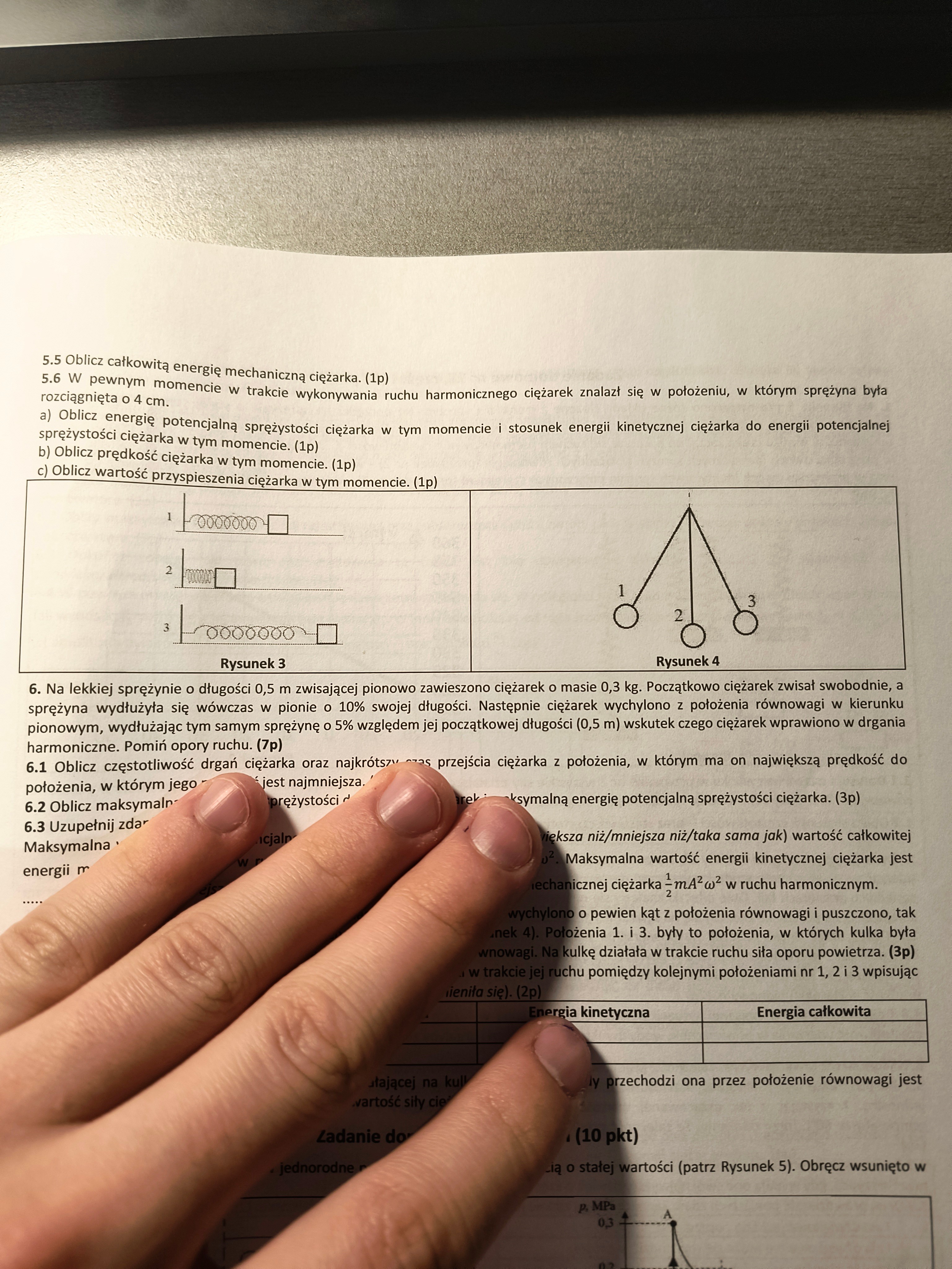 Jeśli chodzi o v, to nie wiem do końca jakiego rodzaju obliczenia używasz (bo piszesz, że wzoru na x(t), ale przecież masz policzyć v(t)), ale da się to zrobić np. tak: zapisujesz x(t) = A*sin(wt + fi0). Wrzucasz tu odpowiednią w i A (fi0 można przyjąć dowolne) i liczysz dla jakiego czasu t dostajesz x = 4 cm. I ten czas t wrzucasz do wzoru na v(t), czyli v(t) = A*w*cos(wt + fi0) i jeśli nie pomylisz się nigdzie w obliczeniach, to dostaniesz dobry wynik :)