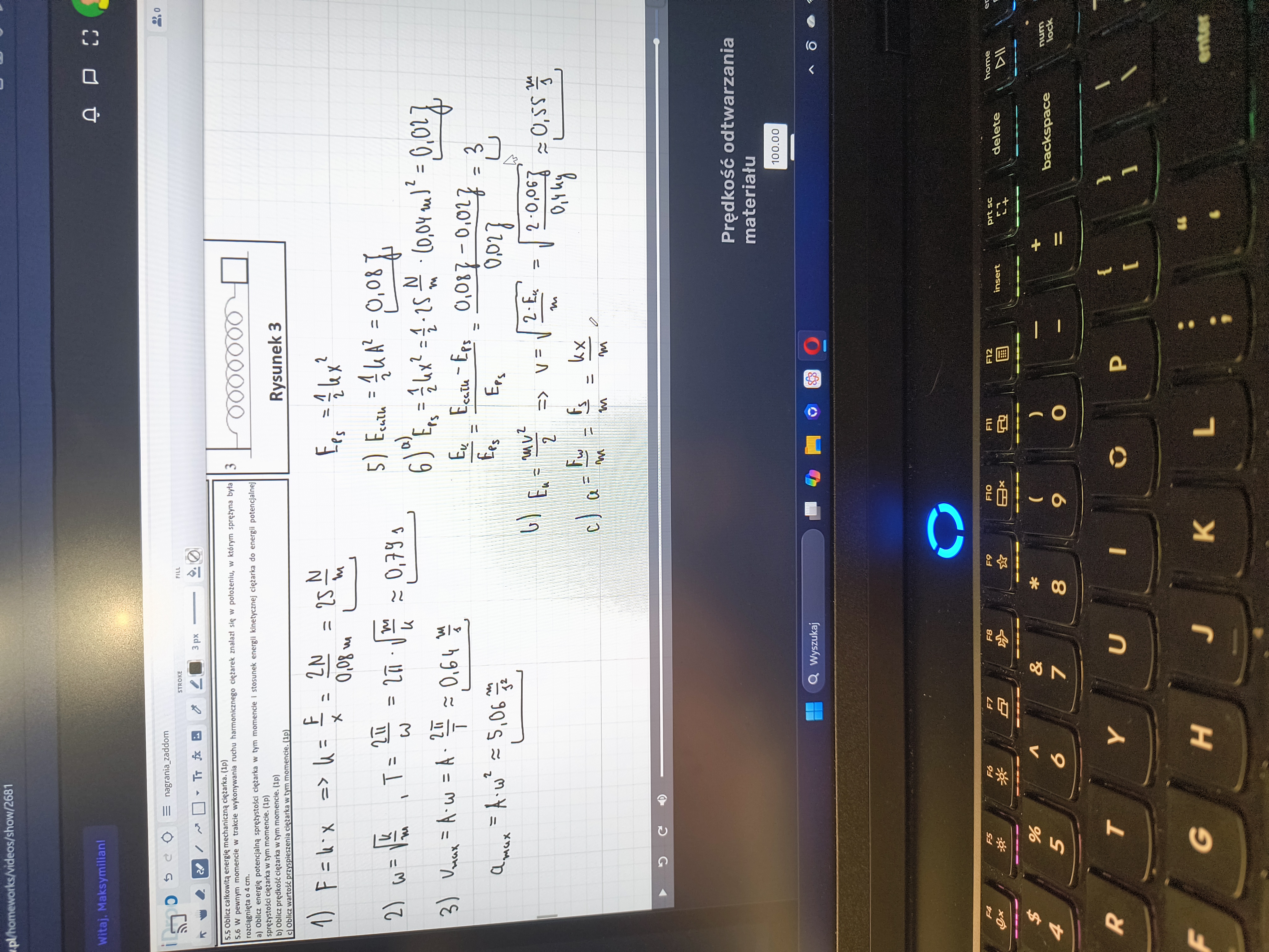 Hmm, najlepiej byłoby gdybyś pokazał swoje obliczenia, bo skoro popełniasz pomyłkę o czynnik 10, to najprawdopodobniej oznacza to, że robisz jakiś prosty błąd obliczeniowy (coś z jednostką albo zwyczajnie z wielokrotnością). Natomiast jak najbardziej można to liczyć tak jak piszesz. Czyli np. przyspieszenie to a = -w^2 * x (tam jest omega do kwadratu, a nie sama omega jak napisałeś). w = pierw(k/m), więc w^2 = k/m. A zatem dochodzimy tak naprawdę do tego samego wzoru co w nagraniu, czyli a = k*x/m i stąd oczywiście wychodzi 2,5 m/s^2.
