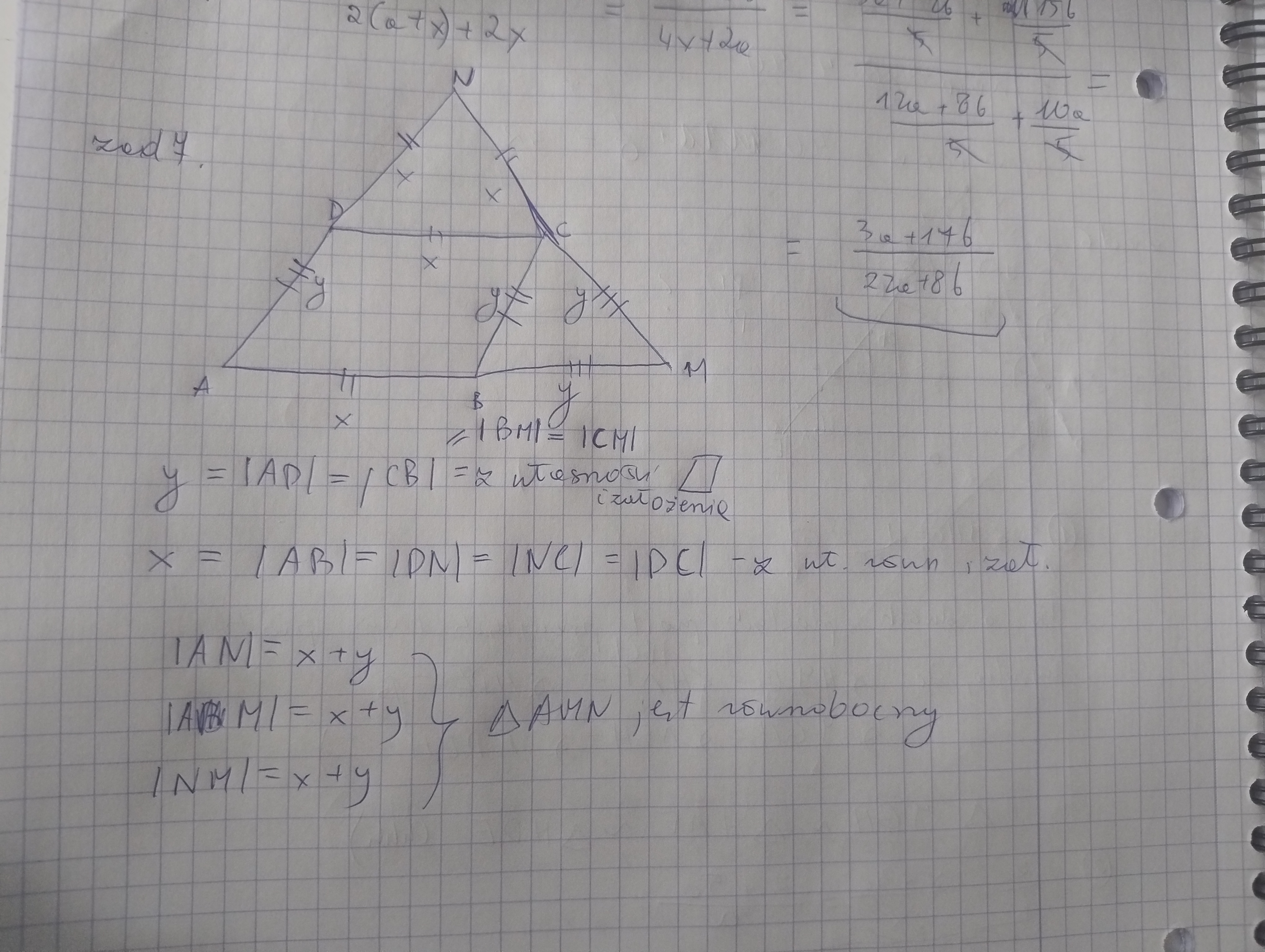 Czy w zadaniu 7 w pracy domowej numer 15 można wykonać to zadanie tak jak ja tu? Po prostu oznaczając odpowiednio boki i je sumując i pokazujac że są równe, zamiast udowadniając to przy pomocy kątów?