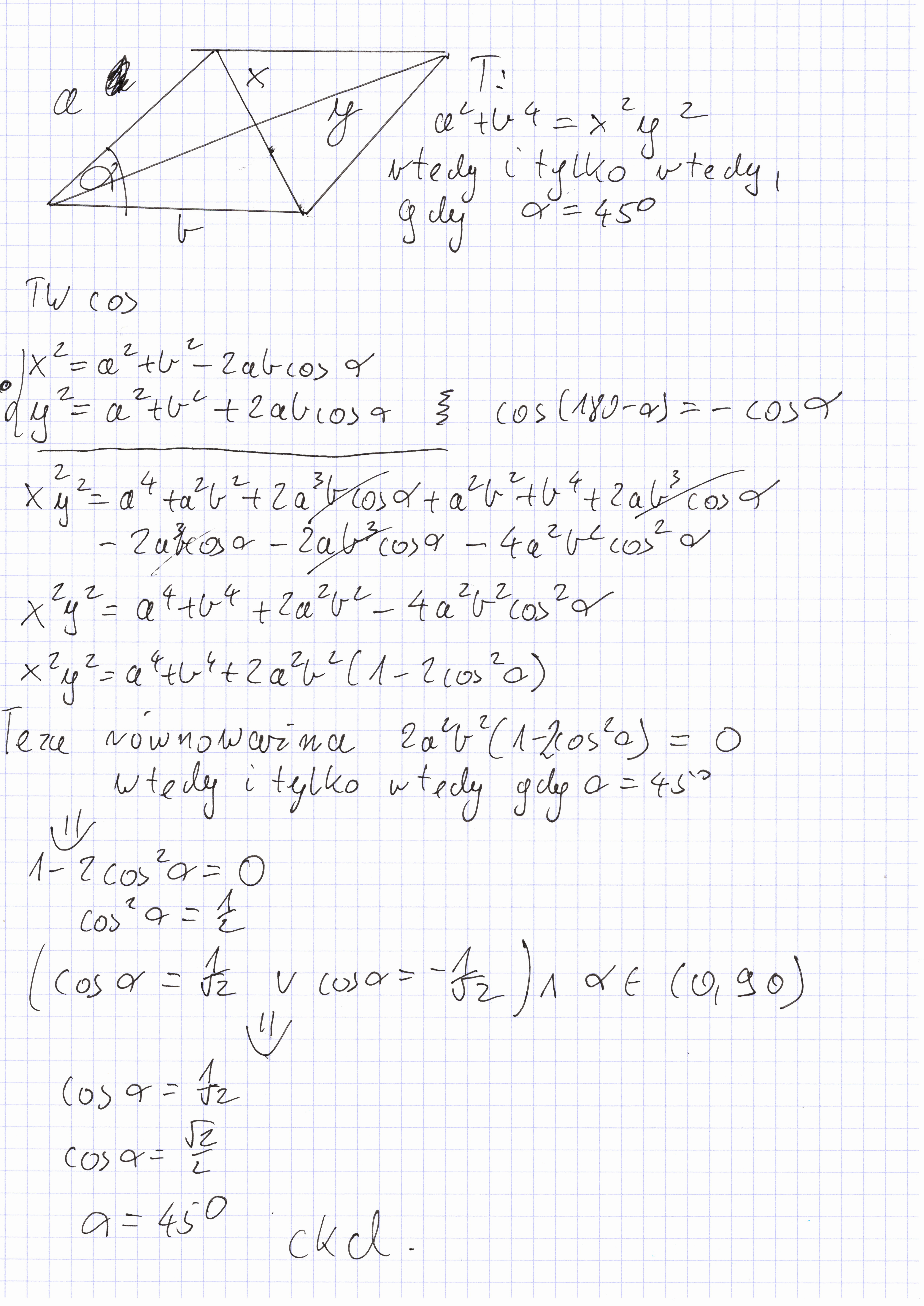 Czy to formalnie jest poprawny dowód? Czy można było po wymnożeniu tw. cosinsuów uznać, ze naszą równoważną tezą jest wyzerowaniem wyrażenia z cosinusem?