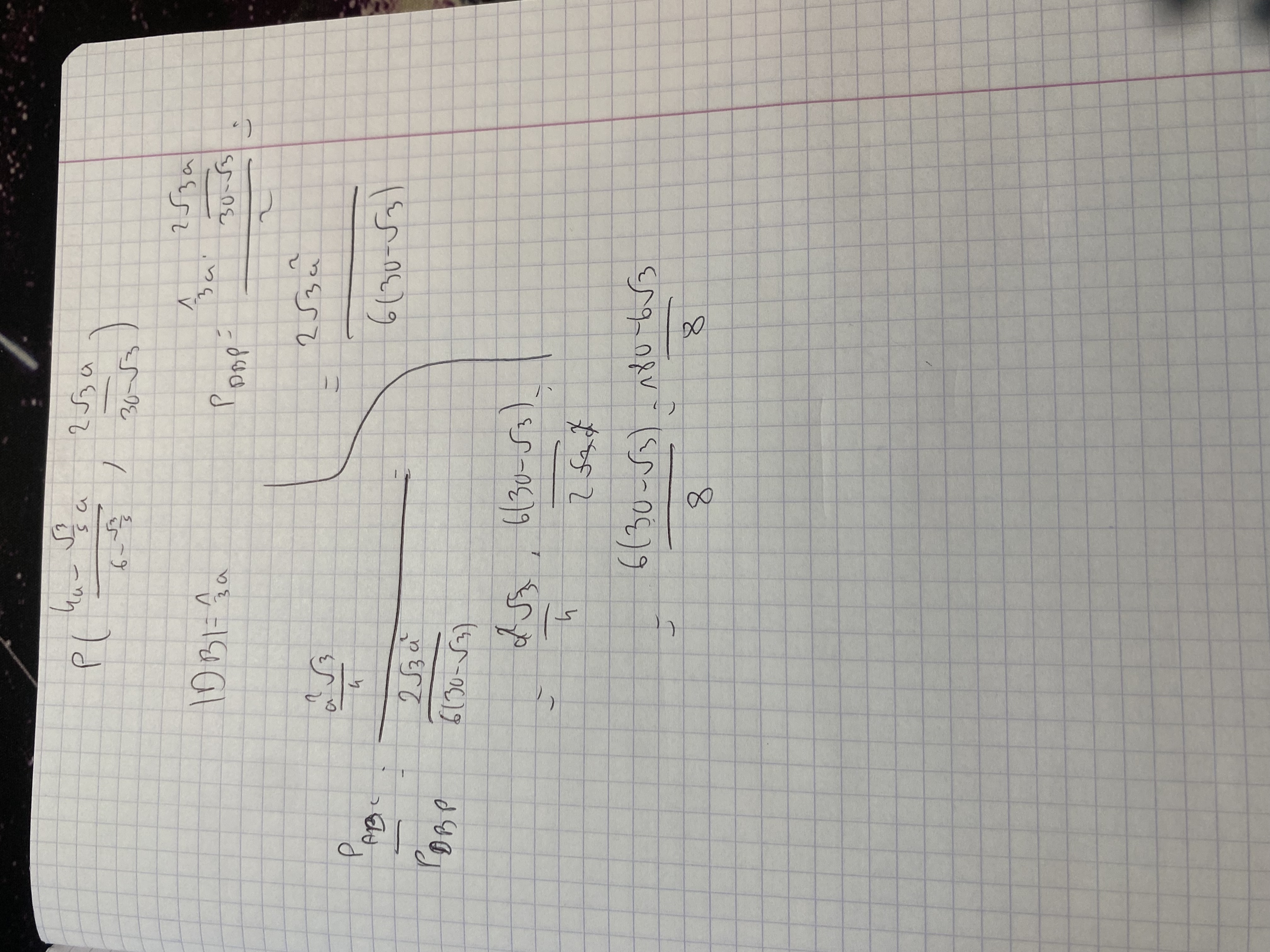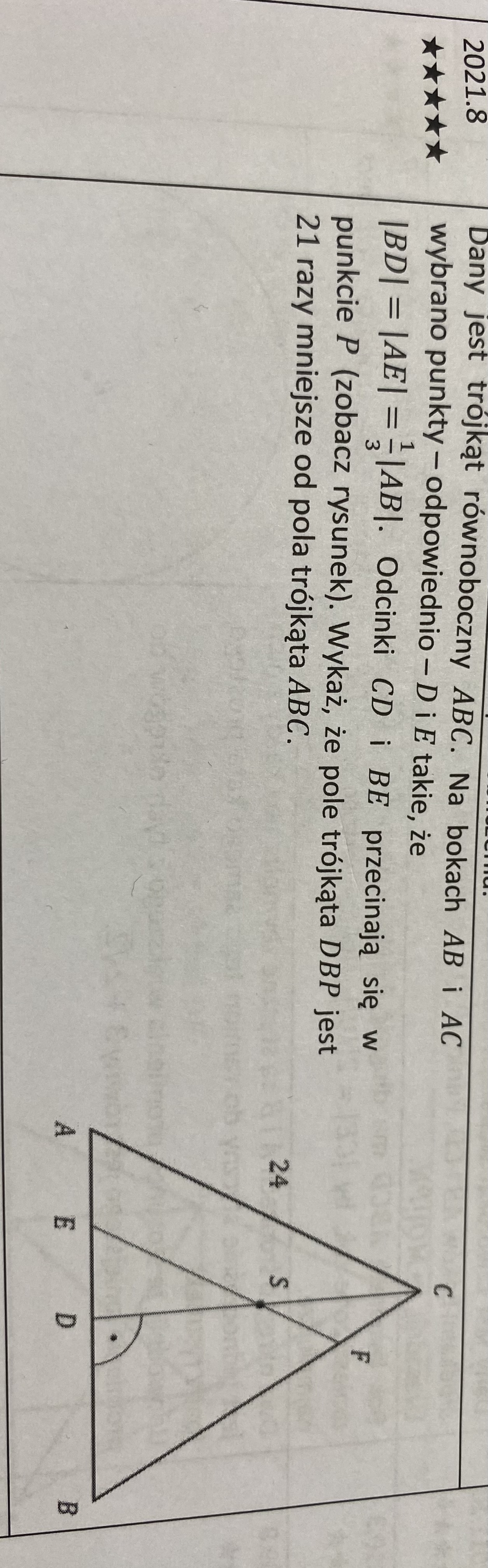 Czy mój sposób jest poprawny?Sposób rozwiązania to sprowadzenie do zadania z geometrii analitycznej. Policzyłem wszytskie boki w zależności od a. Przecięcie dwóch prostych EB o CD to punkt P, następnie liczę pole DBPjako yE *DB *1/2 i dzielę na pole ABC jednak wynik się nie zgadza