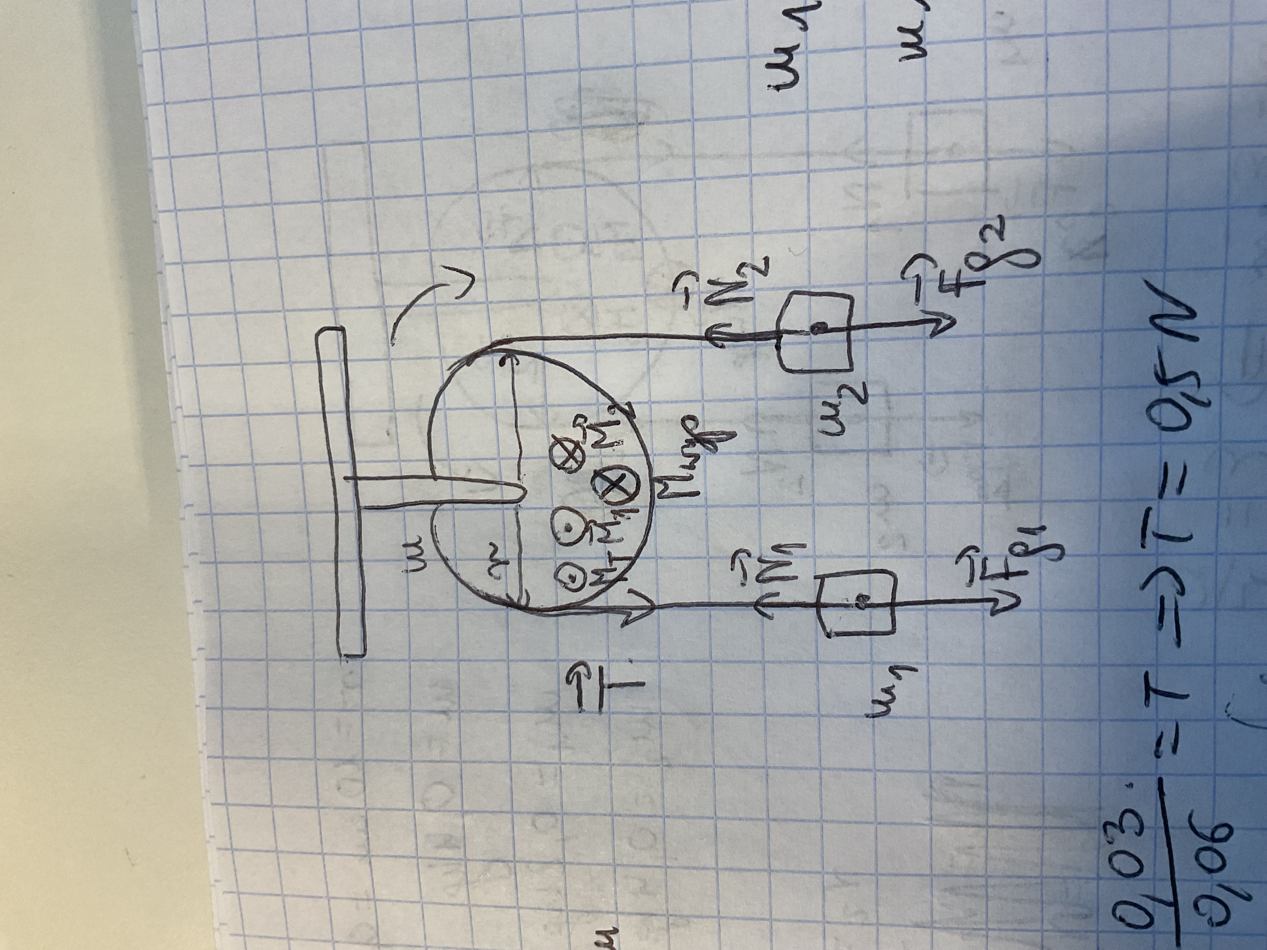 Jak są takie zadania z bloczkami trzeba rozpisywać równania dla ruchu postępowego i obrotowego, ale nie rozumiem jednej rzeczy, czemu nie mamy rysować siły naciągu np N1’ i N2’ o przeciwnych zwrotach do N1 i N2? A momenty siły wyznaczamy właśnie dla siły naciągu N1 i N2? No bo przecież ramię siły idzie od środka tego obracającego się bloczka i później do miejsca przyłożenia siły naciągu, to czemu tego nie rysujemy a moment siły wyznaczamy tak jakby ta siła tam była (no bo chyba jest)
