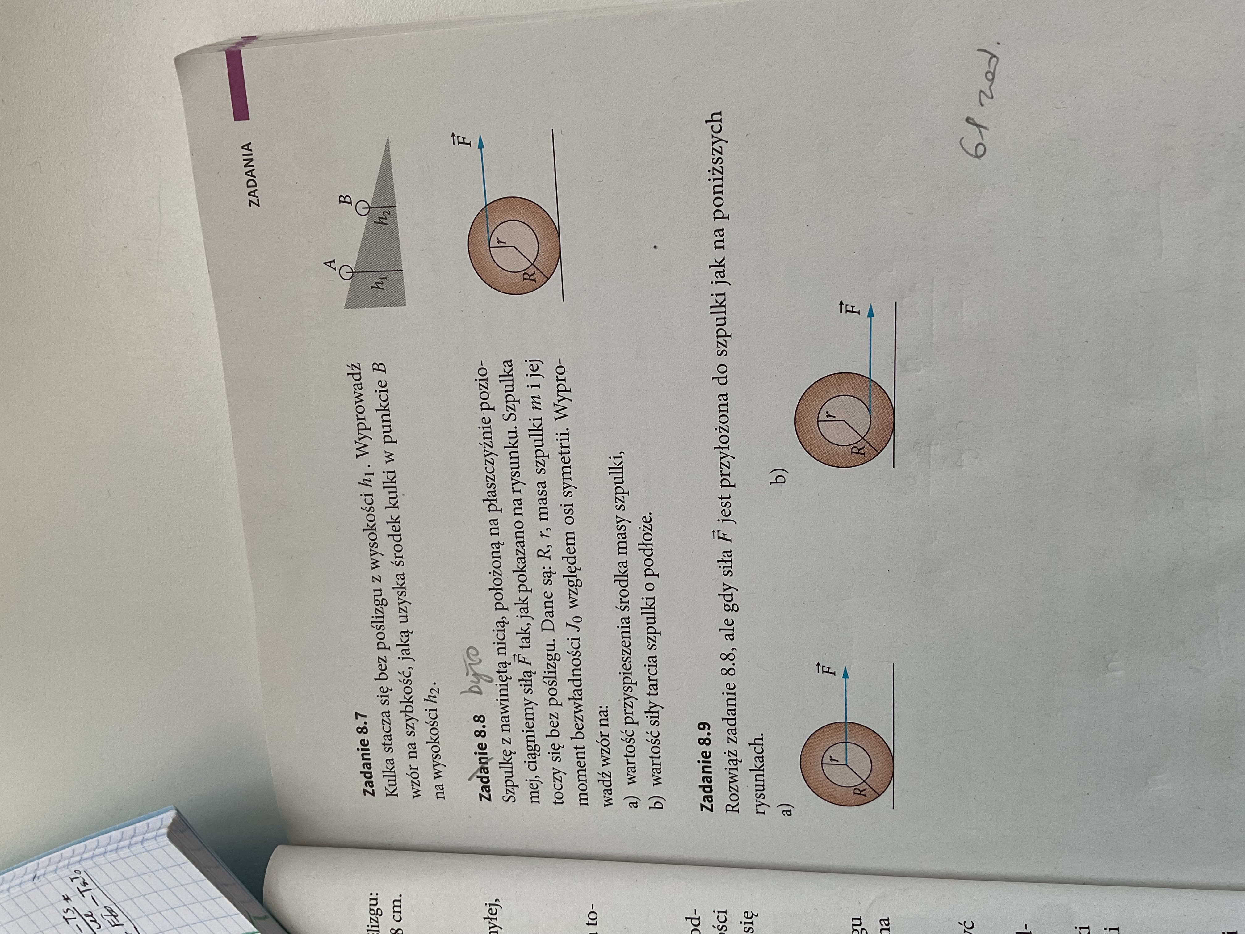 Na lekcji robiliśmy zadanie 8.8 i nauczyciel wyjaśniał nam, że w tym zadaniu tarcie należy narysować przeciwnie do zwrotu siły F czyli w lewo, ale widziałam rozwiązanie w którym zwrot T zrobiono w prawo ( tam było to tak wytłumaczone że w miejscu styku z podłożem prędkość liniowa v będzie mieć zwrot w lewo więc tarcie ma być w prawo) , natomiast w zadaniu 8.9 wydaje mi się że Tarcie powinno mieć w obu przypadkach zwrot w lewo