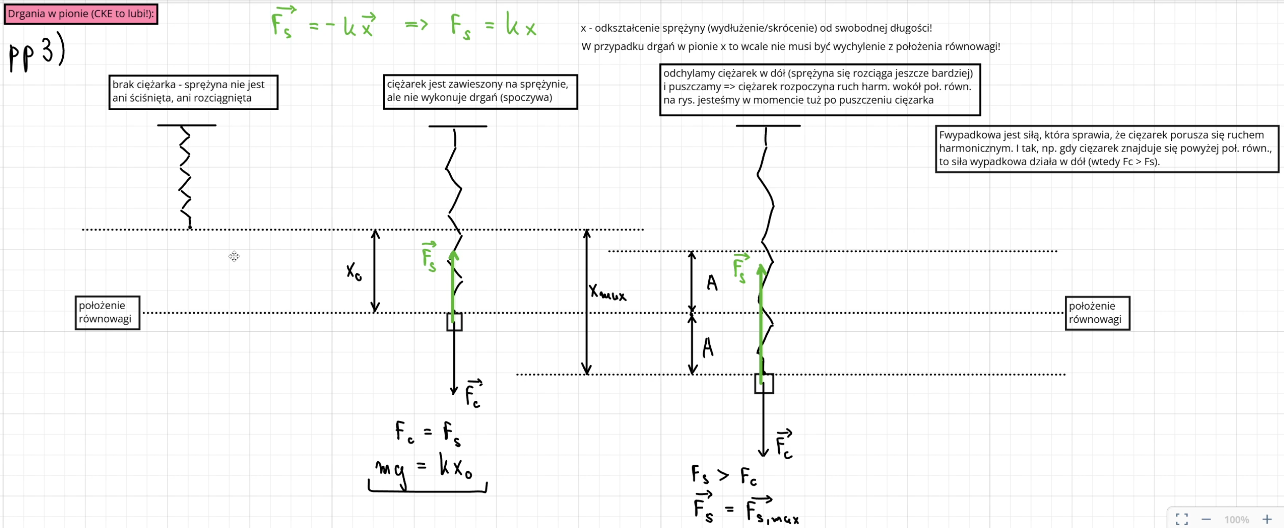 To zależy - dlatego sytuacja ze sprężyną w pionie rozpatrywana była osobno w stosunku do sprężyny w poziomie. W poziomie jest zawsze tak jak piszesz - Fs jest zwrócona do położenia równowagi. Ale w przypadku drgań w pionie oprócz siły sprężystości Fs pojawia się jeszcze siła ciężkości Fg i to siłą wypadkowa tych dwóch sił rządzi ruchem harmonicznym. A zatem w przypadku sprężyny w pionie siła wypadkowa zawsze będzie zwrócona w stronę położenia równowagi. A to jak zwrócona jest sama siła spreżystości sprężyny Fs zależy od tego czy sprężyna jest rozciągnięta, czy "skurczona" od swojej naturalnej długości. Więc musielibyśmy najpierw wiedzieć na jakiej wysokości znajduje się poziom, w którym spręzyna nie jest ani rozciągnięta, ani skrócona. Jeśli jest on powyżej rozpatrywanej wysokości, to siła Fs będzie działała w górę, jeśli poniżej, to będzie działała w dół. Np. na zajęciach rozrysowaliśmy sobie tę sytuację w taki sposób, że ten poziom znajdował się podczas całego ruchu harmonicznego zawsze ponad aktualnym położeniem ciężarka, toteż siła Fs zawsze była zwrócona w górę. Nie zmienia to natomiast faktu, że wspomniana siła wypadkowa sił Fs i Fg zawsze działa w stronę położenia równowagi (zamieszczam poniżej wycinek z zajęć).