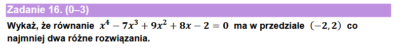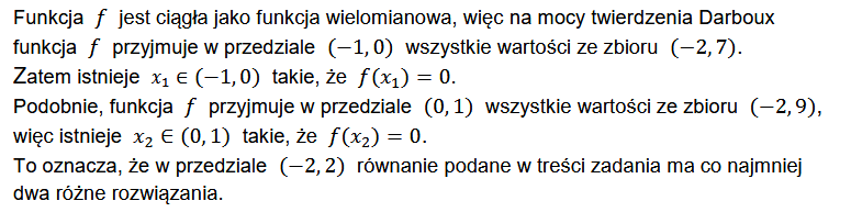 I teraz napisałbym że funkcja wielomianowa jest funkcją ciągłą, zatem z tw. Darboux ma na pewno co najmniej dwa różne rozwiązania.
