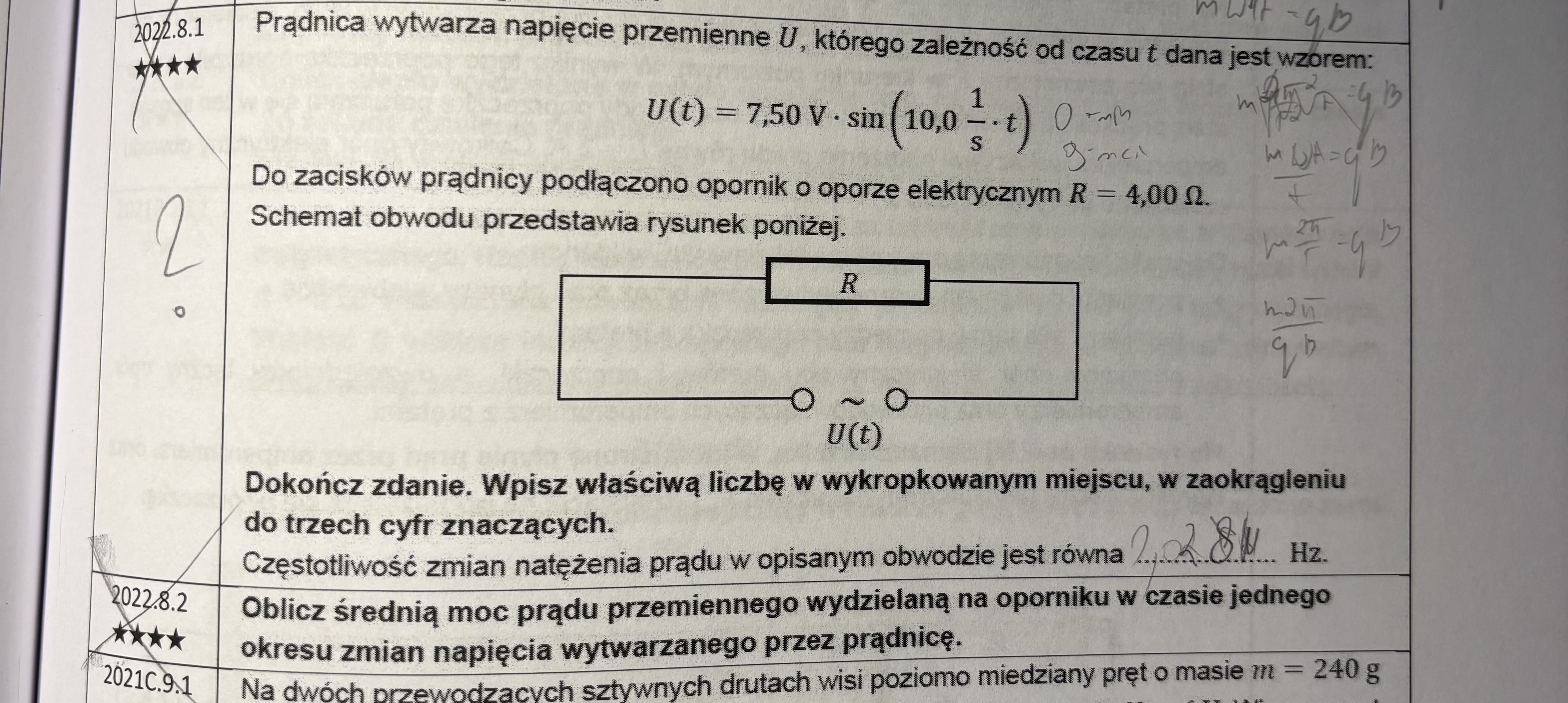 Z tego co widzę, to próbowałaś coś kombinować z siłą Lorentza(?), ale to nie jest dobra droga. Zauważmy, że w treści mamy podaną zależność napięcia od czasu i jest to sinus - a na zajęciach nr 16 mówiliśmy sobie, że jeśli mamy taką zależność napięcia/natężenia od czasu, to w ogólności wyraża się ją wzorem U(t) = Umax*sin(omega*t + fi_0). Czyli częstotliwość wyciągniemy wprost z tego wzoru, zauważmy bowiem, że 10,0 1/s to musi być omega (bo to ona jest przemnożona przez czas t). A omega to przecież 2*pi*f, więc stąd obliczamy f, czyli szukaną częstotliwość zmian napięcia, a co za tym idzie również częstotliwość zmian natężenia prądu.