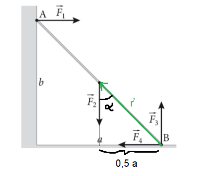 Oni tutaj zrobili niejako dwie rzeczy naraz, a nie zapisali tego dokładnie w rozwiązaniach, tylko dali już ostateczny wynik przekształceń, stąd może to w istocie być niejasne. Zauważmy bowiem, że licząc wartość momentu siły jak sama zauważyłaś trzeba przemnożyć przez siebie długość ramienia siły i tę siłę, ale uwaga - trzeba to jeszcze przemnożyć przez sinus kąta między tym ramieniem i tą siłą - tak wygląda bowiem sposób obliczenia wartości momentu siły, bo jest to wynik iloczynu wektorowego ramienia i siły. A zatem tak naprawdę licząc np. wspomniany przez Ciebie moment siły F2 względem punktu B mamy F2*r*sin(alfa). Możemy jednocześnie zauważyć, że możemy sobie stworzyć taki trójkąt prostokątny jak na rysunku poniżej i sin(alfa) to nic innego jak 0,5 a /r. A zatem rozpatrywany moment siły to: F2*r*0,5a/r = F2*0,5 a. Wychodzi więc to co w podanym rozwiązaniu :)
