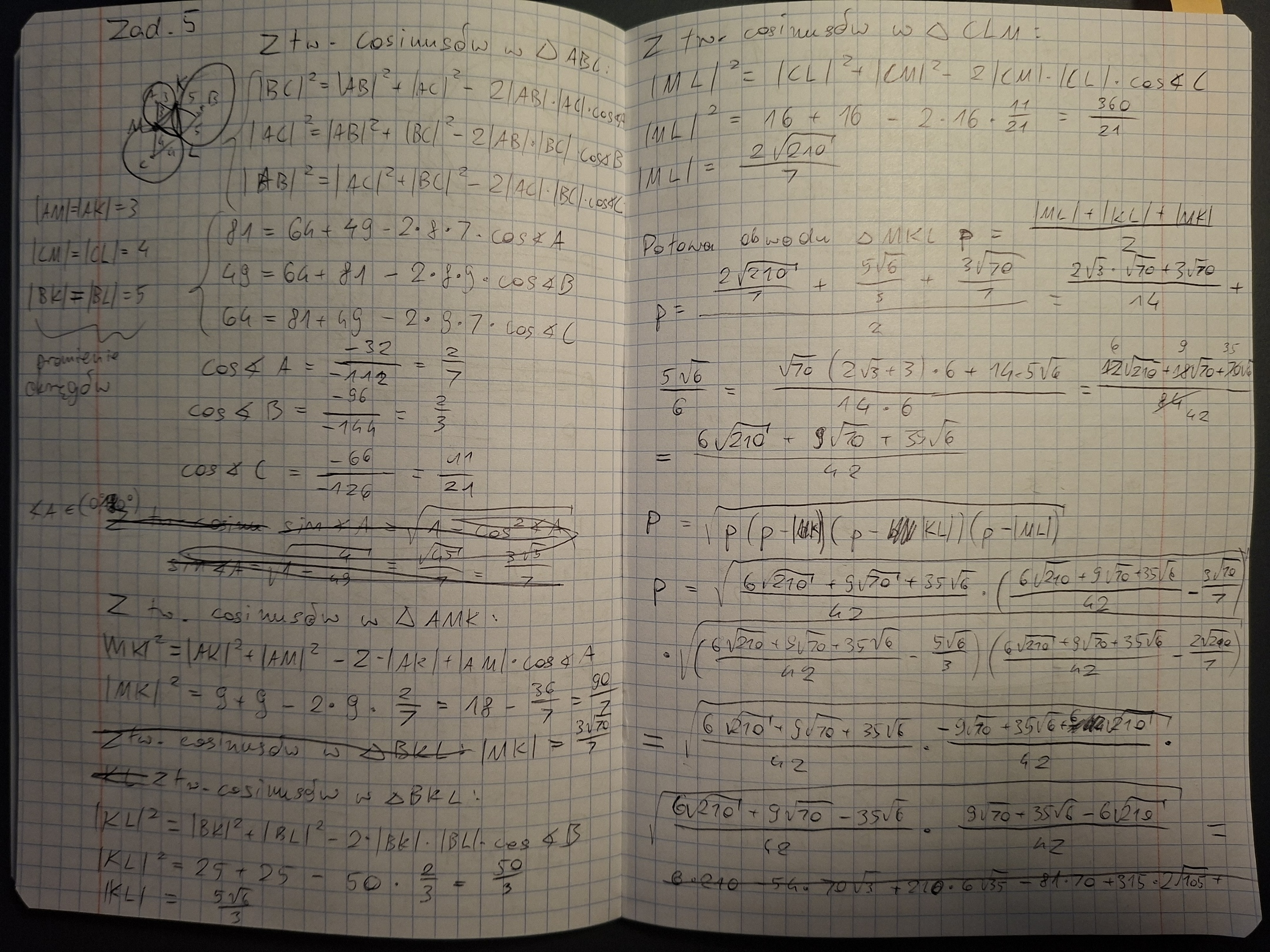 styczności tych okręgów o środkach A i B oznaczamy jako „K”, B i C jako „L” i A i C jako „M”. Oblicz pole trójkąta KLM
