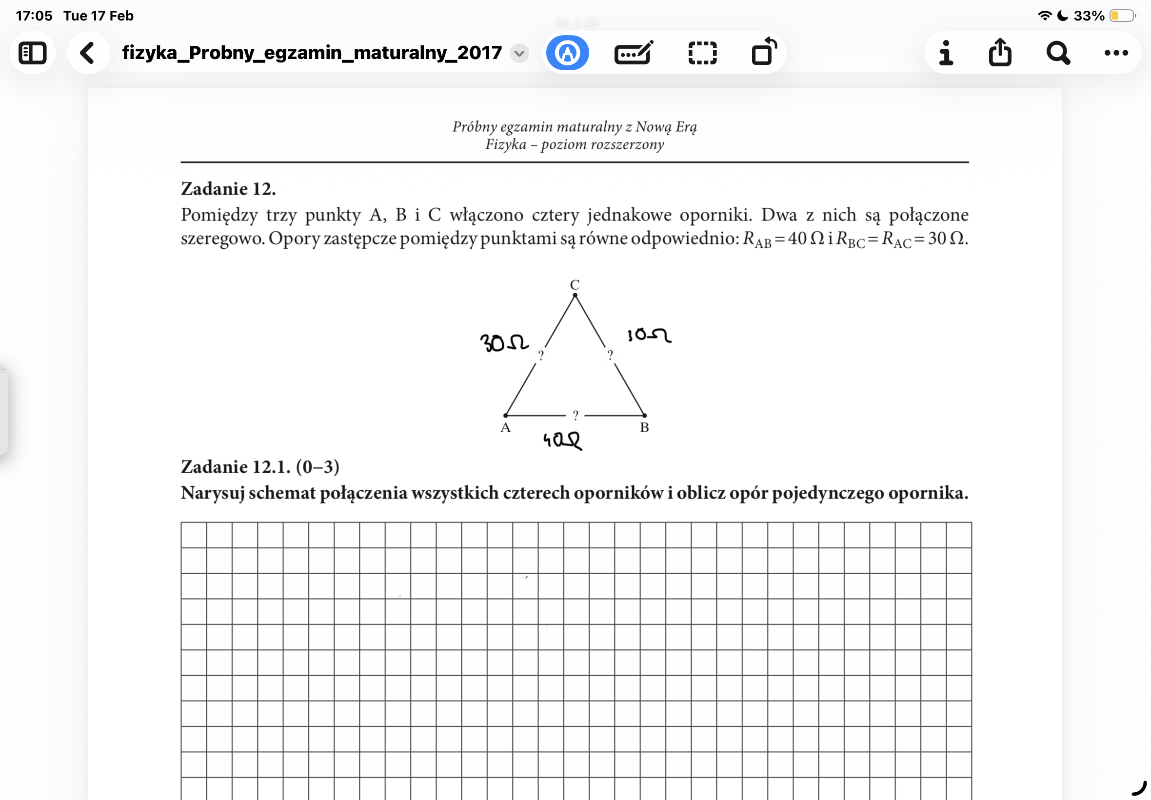 nie rozumiem jak to działa, na logikę między punktami A i B będzie to połączenie szeregowe dwóch oporników, ale skoro te pojedyncze miedzy punktami A i C oraz B i C mają opór 30omów to czemu połączenie szeregowe dwóch takich oporników to 40omów a nie 60?