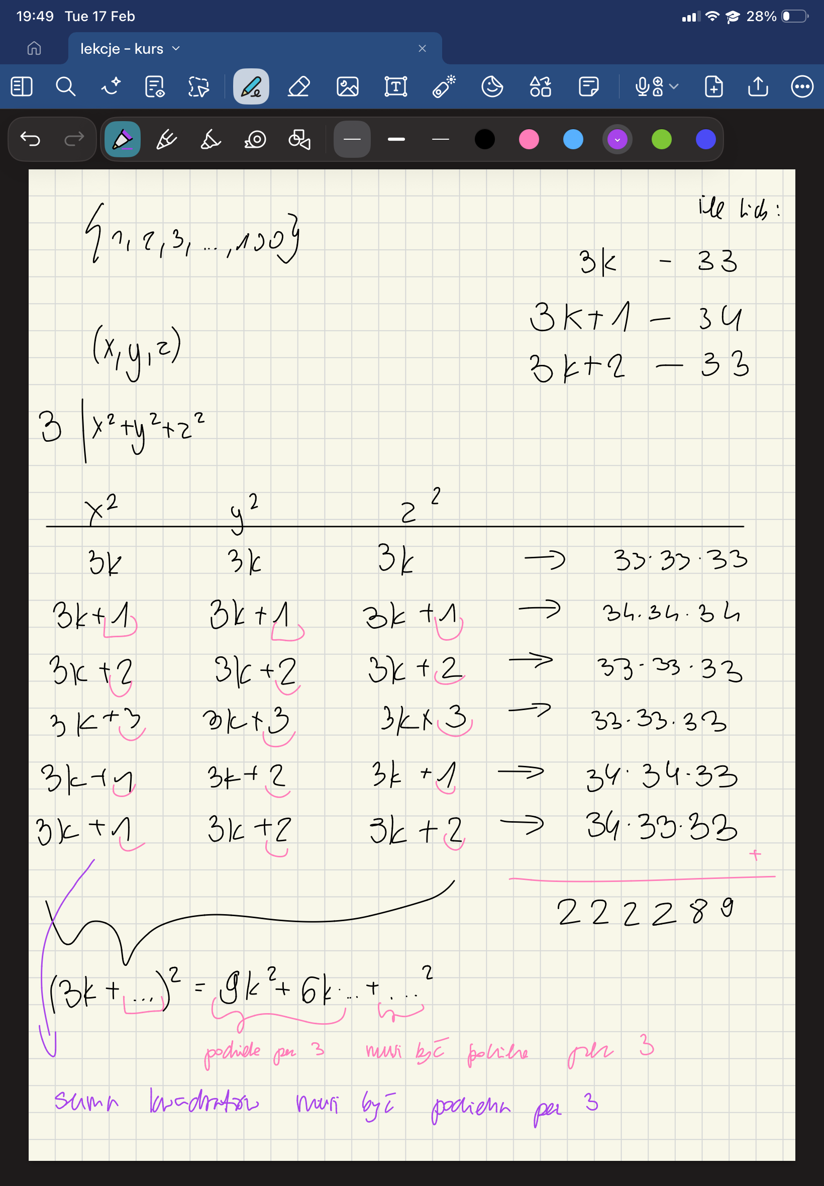 dlaczego w taki sposob nie bedzie poprawnie? wypisalam wszystkie przypadki w ktorych suma kwadratow bedzie podzielna przez 3 (suma kwadratów reszty musi byc podzielna przez 3)