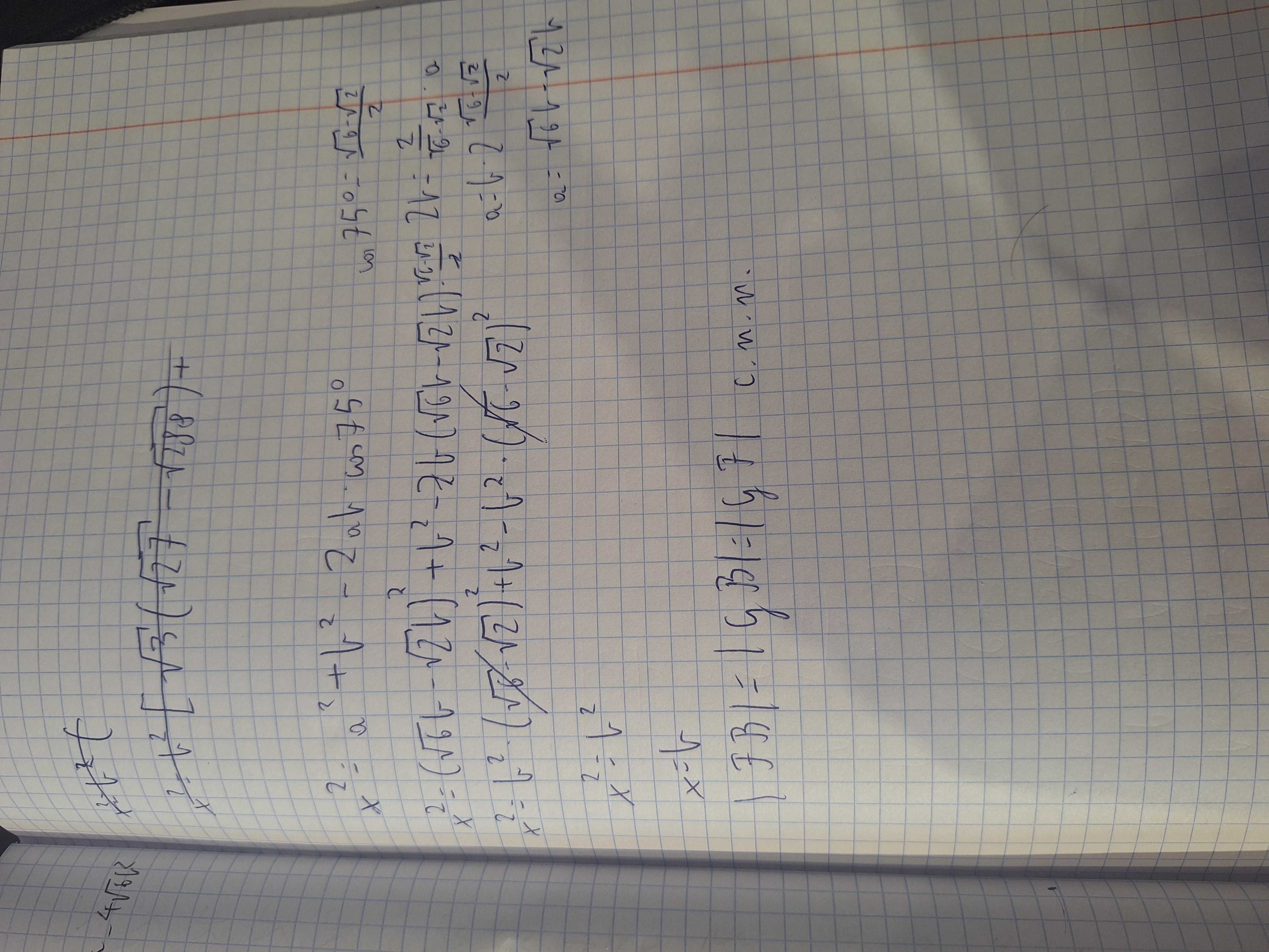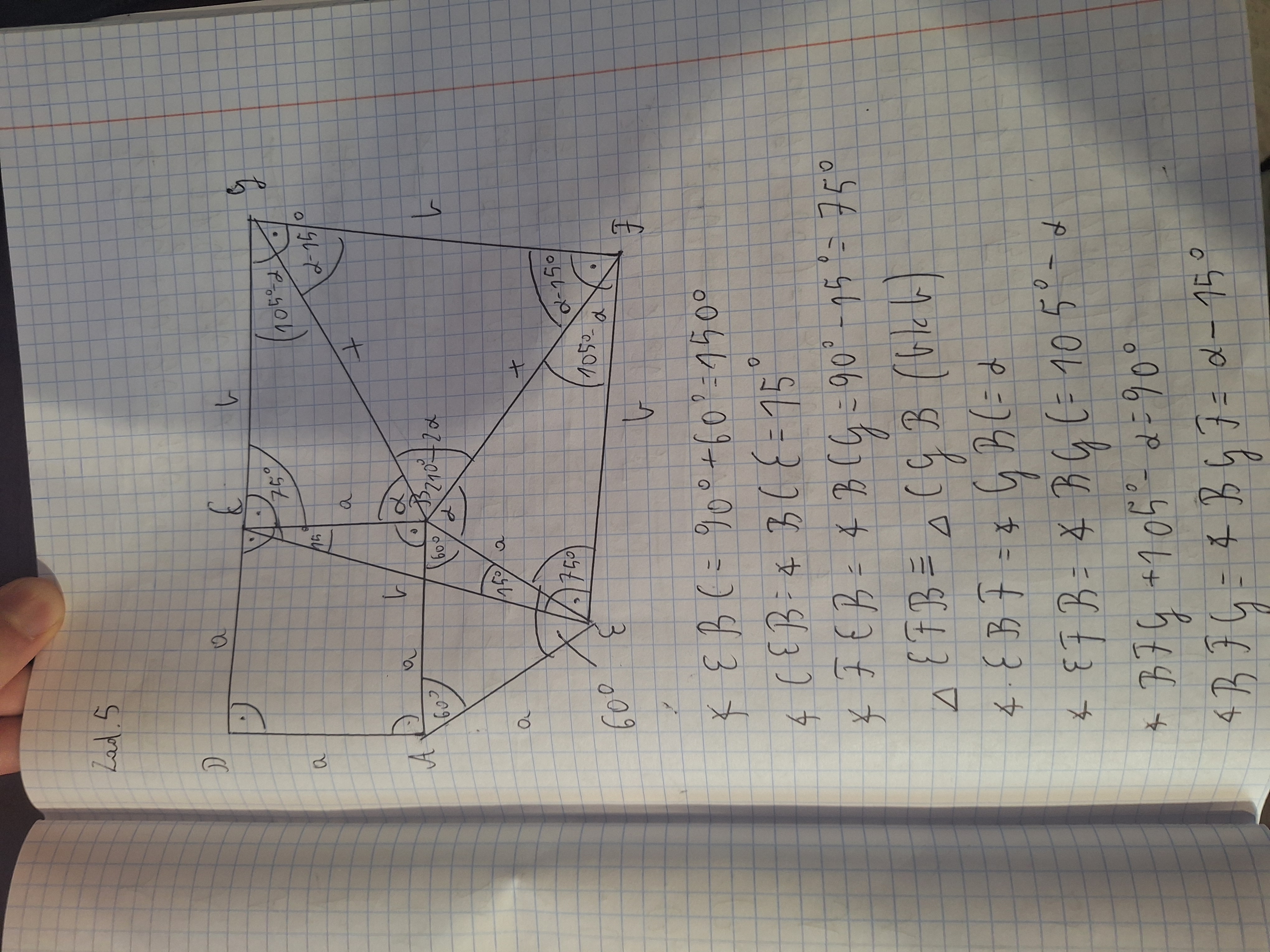 Na początku zaznaczyłem wszystkie kąty na rysunku i potem boki które są równe. Potem udowodniłem, że trójkąt EBF jest przystający do CBG, więc wystarczy teraz udowodnić że są one równoramienne. Starałem się to zrobić z kątów, ale nie wiem czy to jest możliwe, więc dwa razy użyłem twierdzenia cos w trójkącie EBC żeby obliczyć stosunek a do b, a potem w EBF, żeby udowodnić że EF = BF