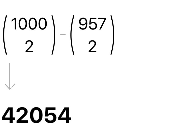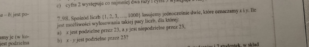 2) Liczb podzielnych przez 23 mamy 43, zatem tych niepodzielnych jest 957. Z tych 957 losujemy jednocześnie dwie - są to "złe" liczby niespełniające warunków zadania (kombinacje)