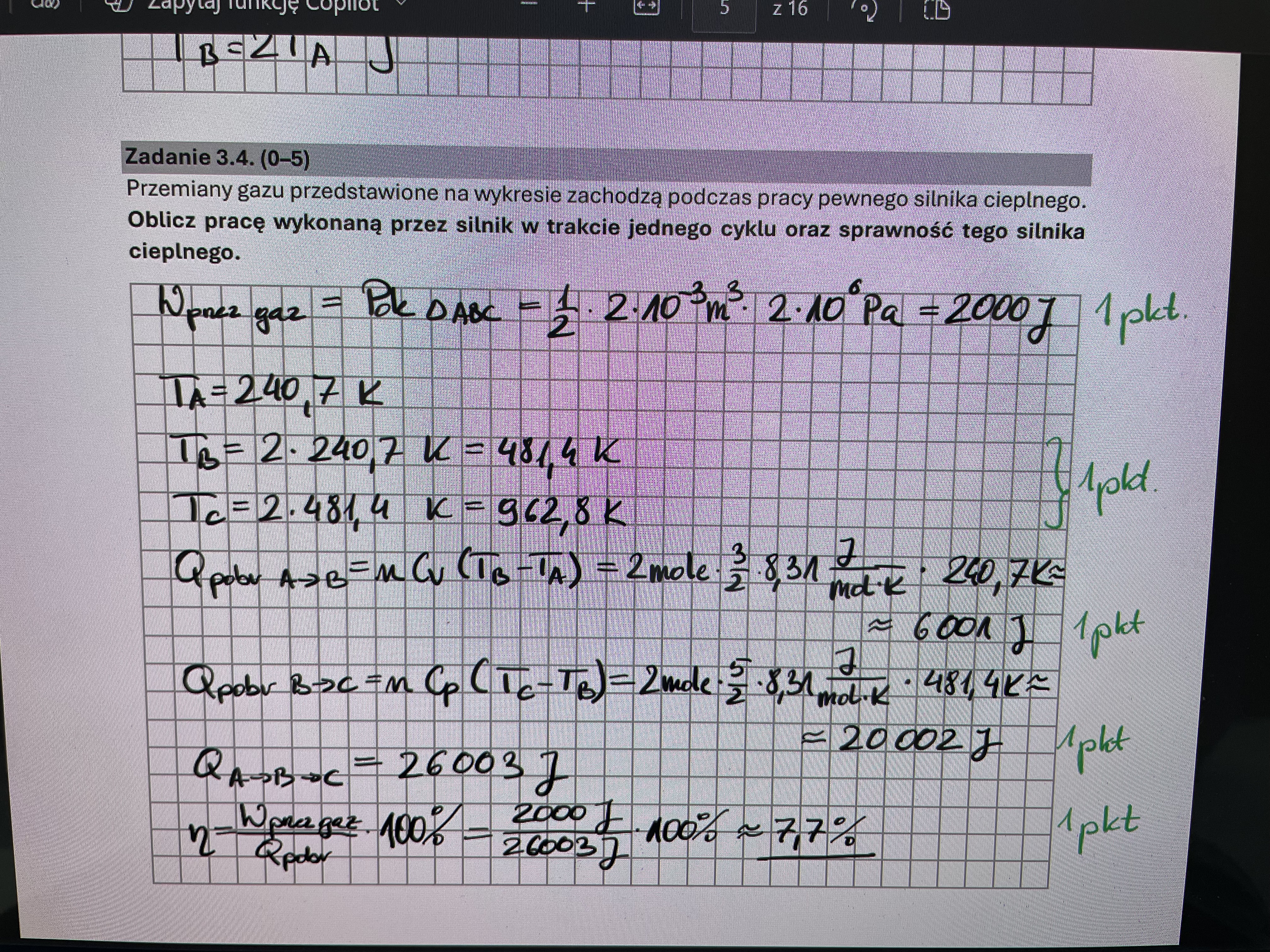 Trzeba wiedzieć czym jest ta Wcałkowita, a raczej w jaki sposób ją policzyć. Bo to czy nazwiemy ją Wcałkowita, czy pracą wykonaną wypadkowo przez gaz to już mniej istotne. W każdym razie jest to praca, którą gdy cykl będzie przedstawiony w układzie p(V) zawsze będzie można obliczyć właśnie jako pole figury ograniczonej przemianami. A formalnie jest to zgodnie z tym co mówiliśmy sobie na zajęciach |Wgazu| - |Wnadgazem|, czyli jest to suma wartości bezwzględnych prac wykonanych przez gaz w tych przemianach, w których gaz w istocie wykonuje dodatnią pracę odjąć suma wartości bezwzględnych prac wykonanych nad gazem (przez siły zewnętrzne) w tych przemianach, w których to siły zewnętrzne wykonują dodatnią pracę. Więc w przypadku tego zadnaia byłoby to Wcałk = |Wbc| - |Wca|. A to, że autorzy nazwali to siebie pracą wykonaną przez gaz, no to na to już nic nie poradzimy ;) choć wg mnie takie nazewnictwo może być mylące, dlatego na zajęciach używałem jednak nazwy Wcałkowita, poza tym jest to spójne z tym co daje CKE w arkuszach, czy też w karcie wzorów.