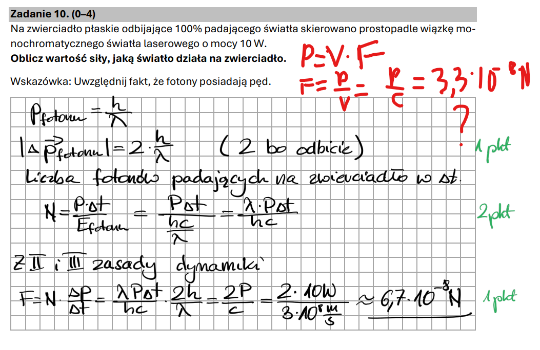 Podeszłem do tego zadania tak jak jest czerwonym markerem ale wynik wyszedł o połowe za mały. Czy powinienem z wiadomości " odbijające 100% padającego światła" wywnioskowac że oddziałujemy ze zdwojony pędem, a co za tym idzie siła na lustro, czy jedynym poprawnym podejściem jest tak jak w rozwiązaniu?