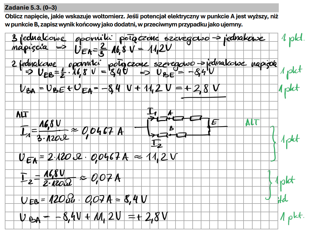 Obliczyłem jak w proponowanej alternatywnej odpowiedzi natezenia prodów ale Napiecie dla oporników przed punktami A i B zamiast za nimi jak w odpowiedzi. Wynik wyszedł ten sam, ale ze znakiem przeciwnym. Czy można tak robic czy powinienem patrzeć raczej na spadki napięcia za szukanymi punktami
