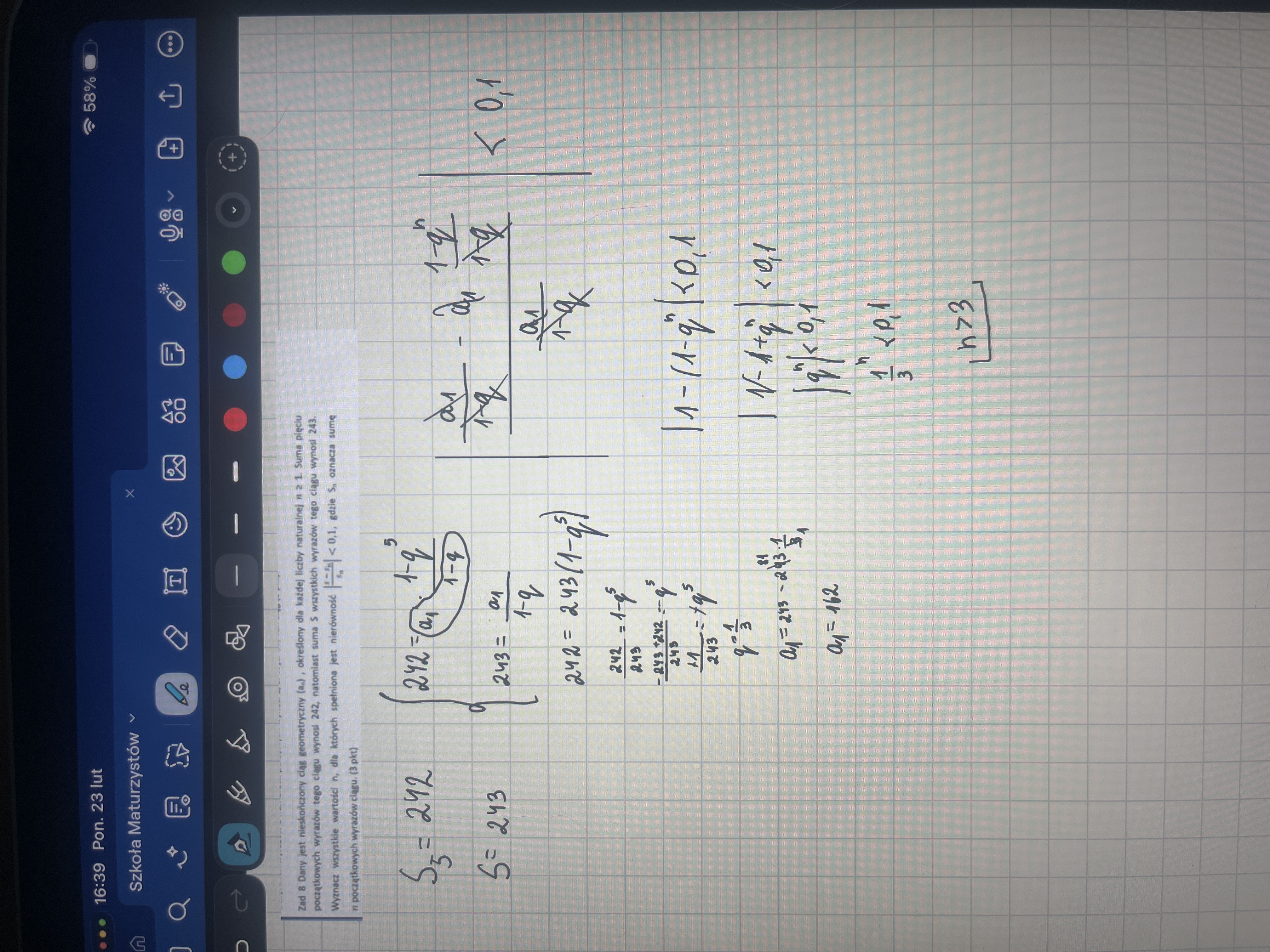 (1/3)^3 = 0.037 dla n = 3 zachodzi i tylko zły jest ostateczny warunek, bo z analizy wynika że n > 2. Może chciałeś napisać n >= 3 i misclick