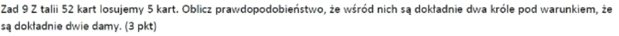 Co w poleceniu kierunkuje nas do poniechania liczenia kolejności w jakiej były losowane te karty? Bo samo policzenie przypadków jest z kombinacji, ale myślałem że kolejność wyboru musi być też uwzględniona bo karty sa rozróznialne (dama trefl, dama karo, dama kier, itd)