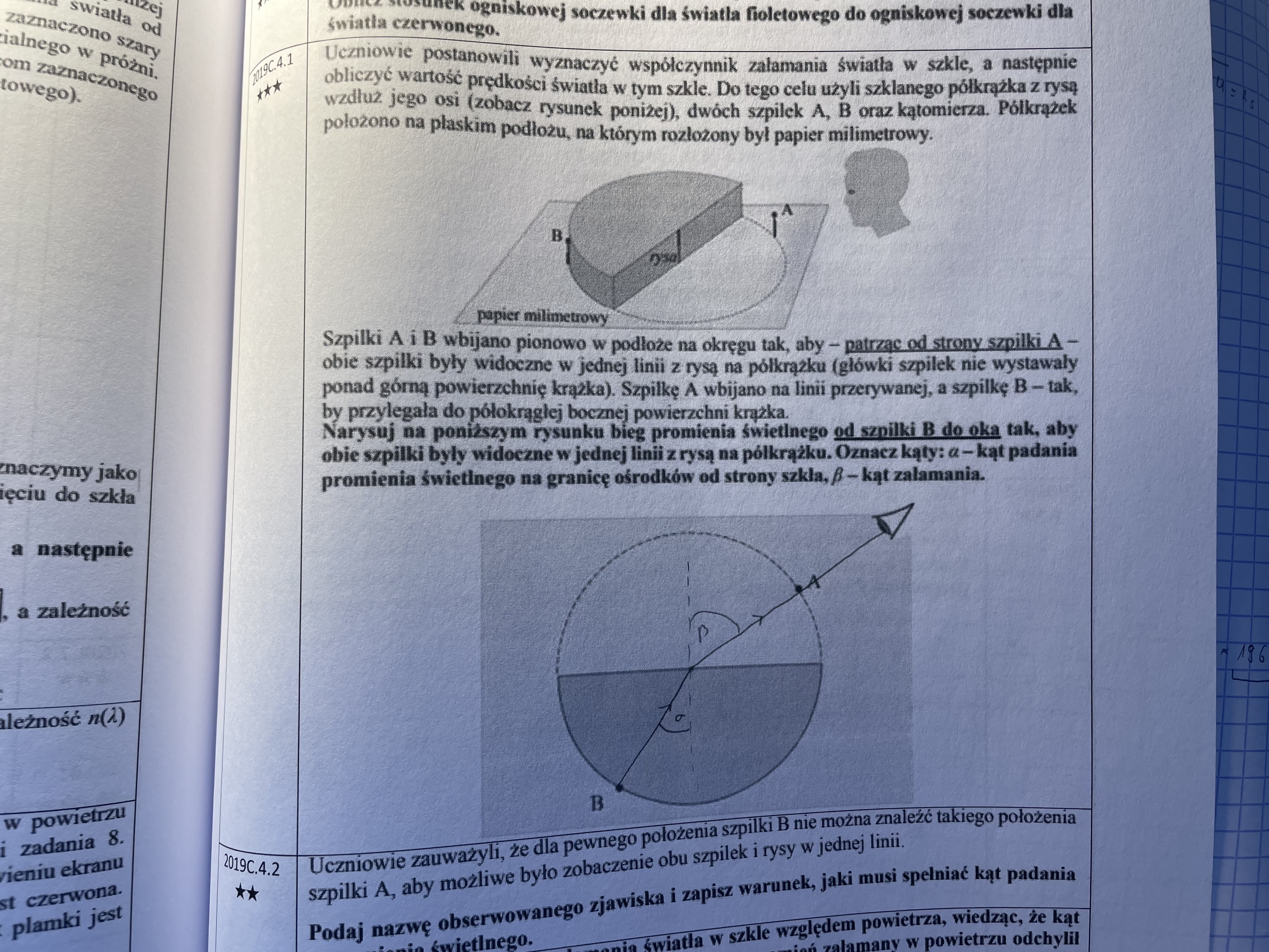 To nie jest żadna ogólna metoda, nie musimy zatem sami nic takiego znać, tutaj po prostu wymyślono taki akurat sposób przeprowadzenia doświadczenia. I to jak zostało to zrobione zostało opisane w treści. Umieszczono te szpilki tak, by patrząc od strony szpilki A, były one w jednej linii z tą centralną rysą na szklanym półokręgu. A to oznacza, że w istocie jeden z promieni świetlnych wychodząc z B (jedna szpilka) trafia w rysę na szklanym półokręgu i w tym miejscu wychodzi ze szkła. Następuje w wyniku zmiany ośrodka załamanie tego promienia świetlnego i trafia on w punkt A (druga szpilka). A zatem ten promień świetlny biegnie dokładnie tak jak to narysowałaś. Więc dobrze tutaj zinterpretowałaś sposób przeprowadzenia tego doświadczenia - i o to tu chodziło :)