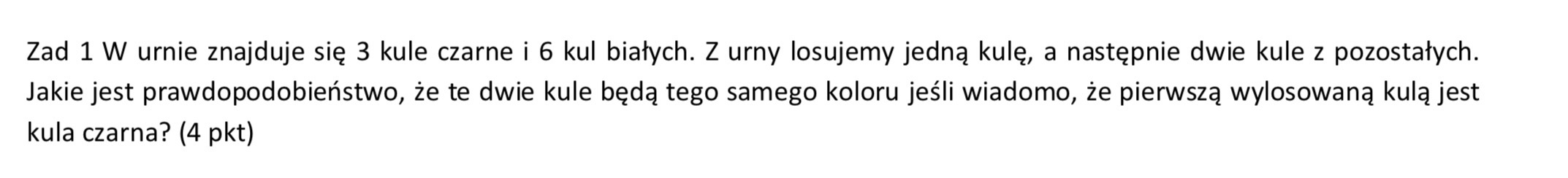 Hej mam pytanie do tego zadania. Dlaczego kiedy rozpisujemy drzewko to w tym przypadku, prawdopodobieństwa dla kul, które możemy wylosować w czasie drugiego rzutu to nie będzie poprostu np. 2/8 i 6/8 (bo po pierwszym wybraniu kuli czarnej zostają nam 2 czarne i 6 białych) tylko należy z tego ułożyć kombinacje np. 5 po 2 przez 8 po 2