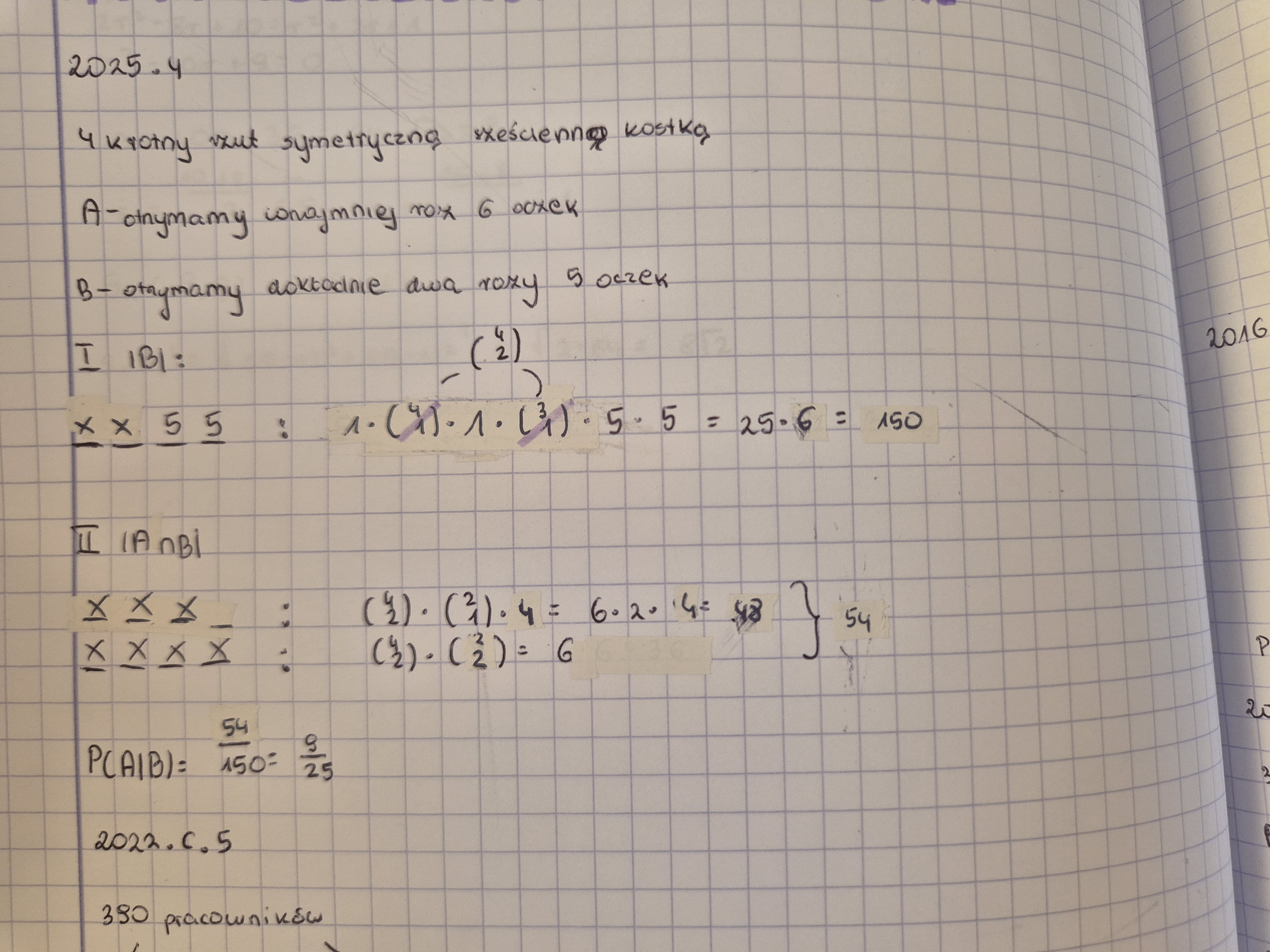 Dlaczego skoro w rzucie kostkami kolejnosc ma znaczenie, to np. W I) |B| gdzie wybieram miejsca gdzie otrzymam 5 oczek to muszę zrobić 4 po 2, a nie mogę zrobić 4 po 1 i potem 3 po 1 skoro kolejność ma znaczenie?