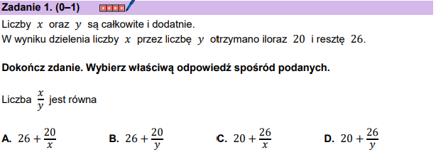 Natomiast z założeń dotyczących reszty jasno wiemy, że reszta jest liczbą nieujemna, która jest mniejsza od dzielnika, a więc 0 =< r < dzielnik, wiec skoro r = 26, to 26 < dzielnik, wiec y > 26.