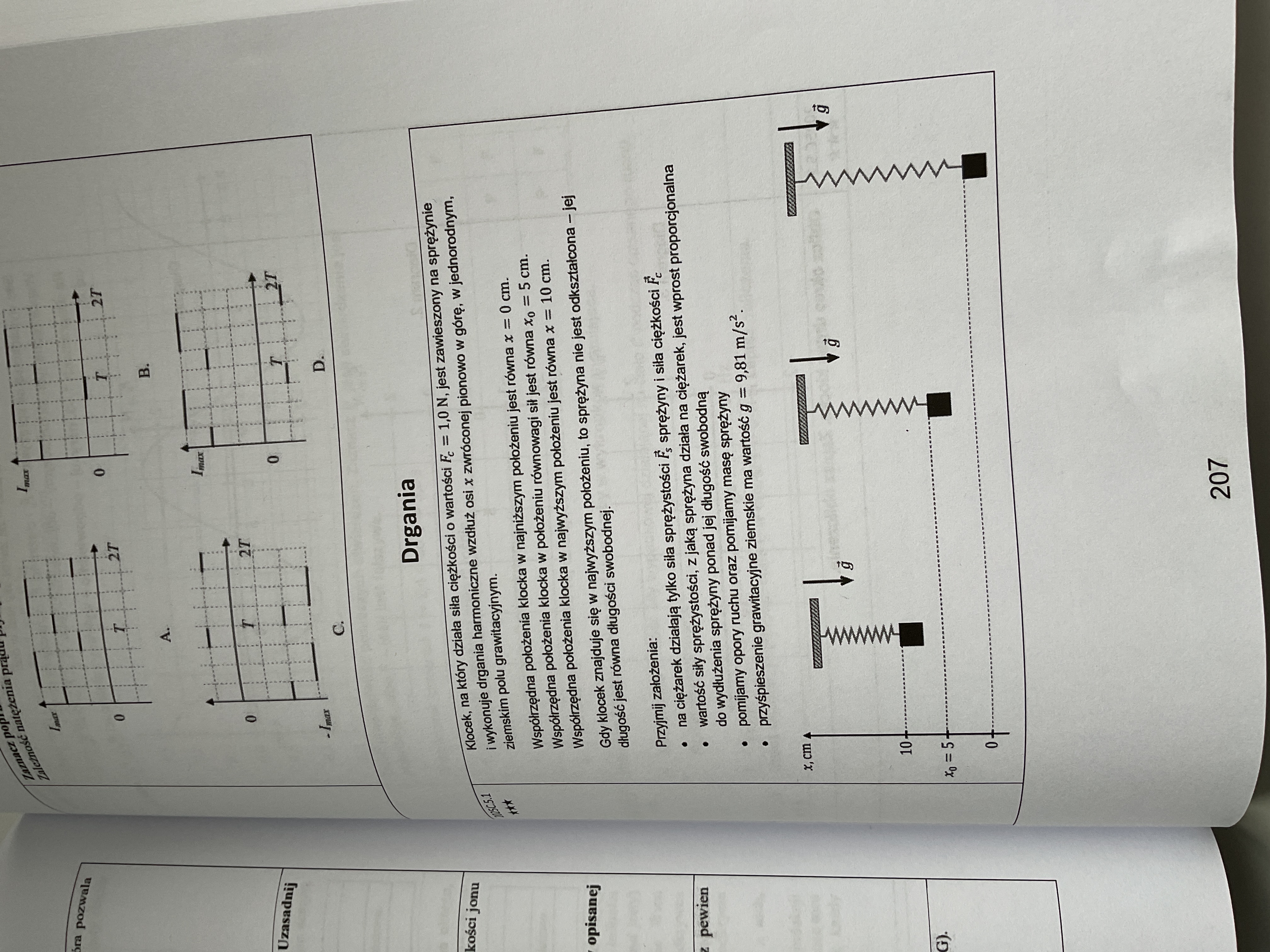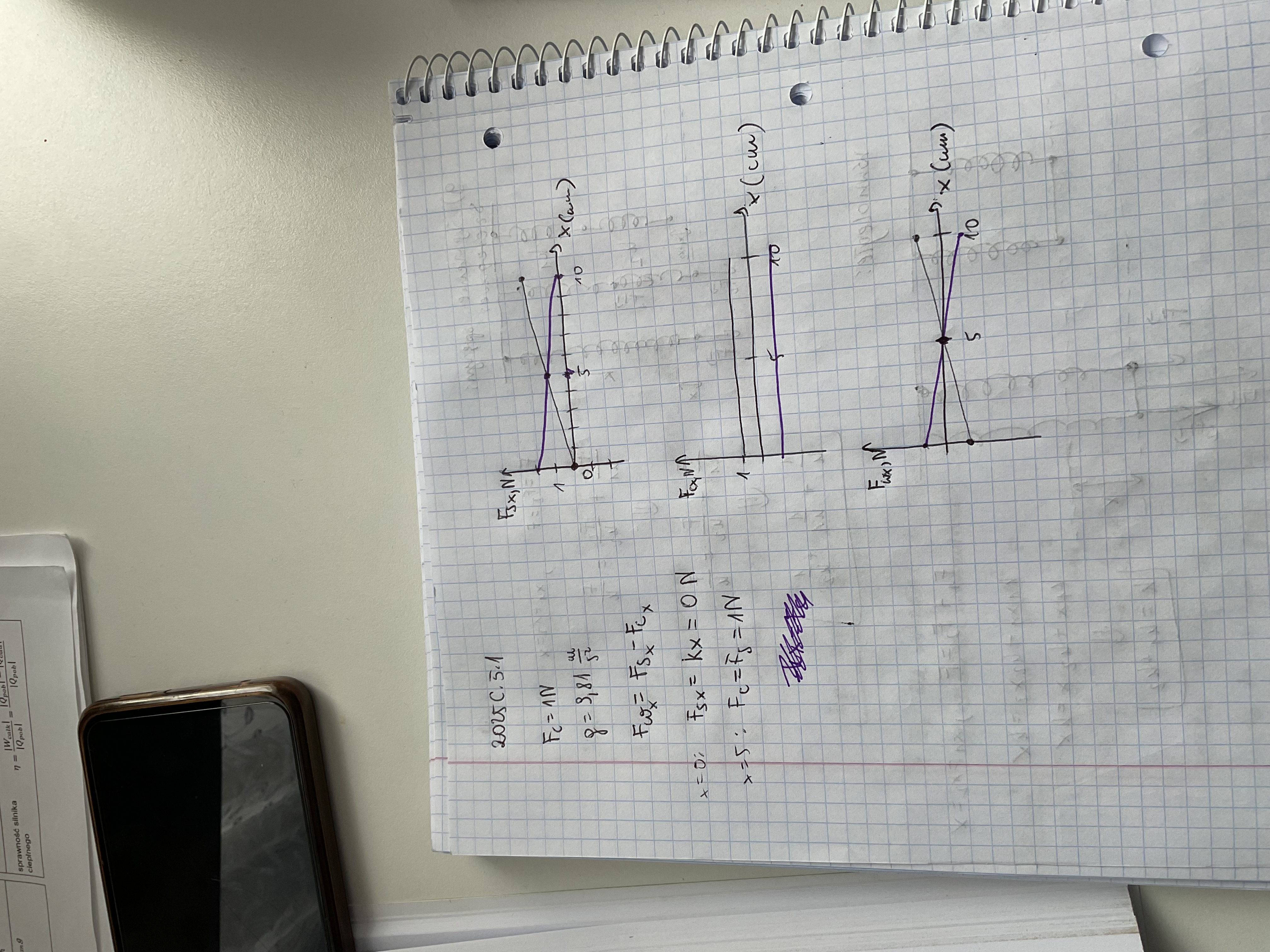 Wynika to z definicji tych sił. Siła ciężkości to po prostu mg i nie ma znaczenia tutaj położenie ciężarka, więc przyjmuje ona dla każdego x stałą wartość mg = Fc = 1 N (zgodnie z treścią), przy czym jest ona zawsze zwrócona w dół, a więc przeciwnie do zwrotu osi x, więc x-owa współrzędna siły ciężkości będzie zawsze ujemna i równa 1 N. Stąd mamy środkowy wykres. Siła sprężystości z kolei wyraża się wzorem Fs = -k*x, gdzie x to odkształcenie sprężyny. Minus świadczy o tym, że to siła ma przeciwny zwrot do tego odkształcenia (jeśli sprężyna jest rozciągnięta, to siłą próbuje tę sprężynę ścisnąć do naturalnej długości). I teraz trzeba bardzo uważnie spojrzeć jakie oznaczenia jeśli chodzi o oś x przyjęli autorzy zadania, bo jest to nieco inny x niż ten ze wzoru. Mianowicie zgodnie z treścią, gdy ciało znajduje się w najwyższym położeniu, czyli dla x = 10 cm, sprężyna w ogóle nie jest odkształcona, więc wtedy siła sprężystości jest zeroa (bo ten x ze wzoru na siłę sprężystości Fs = -k*x jest zerowy). Co więcej, przyjęli oni, że położenie równowagi występuje wtedy gdy położenie na osi pionowej x = 5 cm. Wówczas zatem wartość Fsx = 1 N, tak by siła Fs zrównoważyła siłę ciężkości Fc (to własnie się dzieje w położeniu równowagi. No i teraz zauważmy, że gdy położenie ciężarka x = 0 cm, to sprężyna jest dwa razy bardziej rozciągnięta niż w położeniu równowagi, więc Fsx też musi być dwa razy większa. Więc dla x = 0 cm mamy Fsx = 2 N. Z samej postaci wzoru Fs = -k*x widzimy, że zależność wartości tej siły od odkształcenia sprężyny jest liniowa, więc uzyskane punkty należy połączyć linią prostą i stąd mamy wykres nr 1. Jeśli zaś chodzi o x-ową współrzędną siły wypadkowej, to jest to zwyczajnie suma Fsx i Fcx, stąd mamy wykres nr 3.