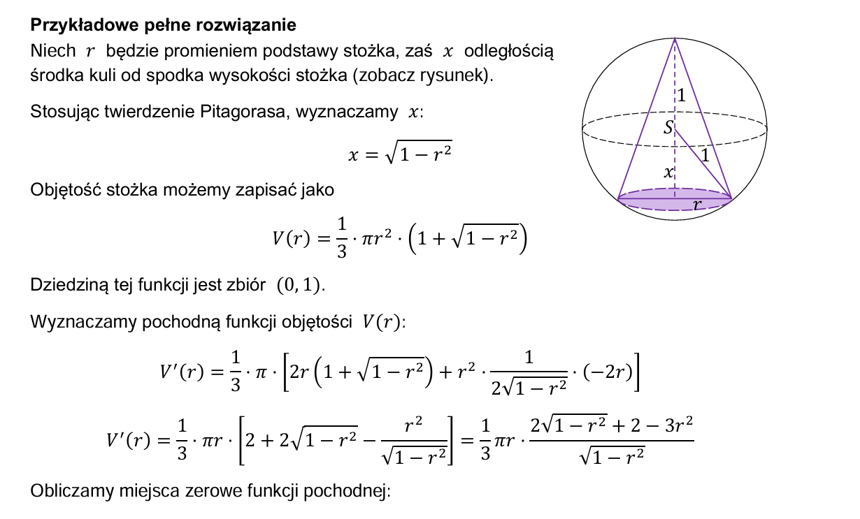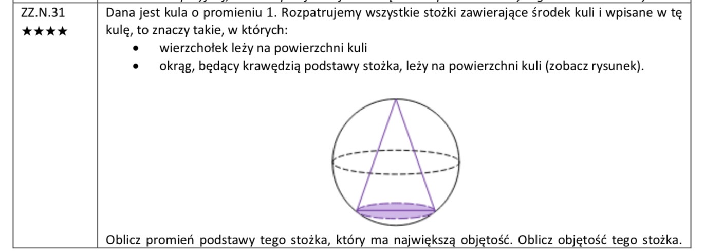Mam pytanie o dziedzinę. Czy nie powinniśmy rozważyć przypadku, gdy promień stożka jest równy 1 i jego wysokość też jest równa 1? Wyjdzie mniej niż w ostatecznej odpowiedzi, ale czy "stożki zawierające środek kuli" nie znaczy, że środek może być też na środku podstawy stożka?
