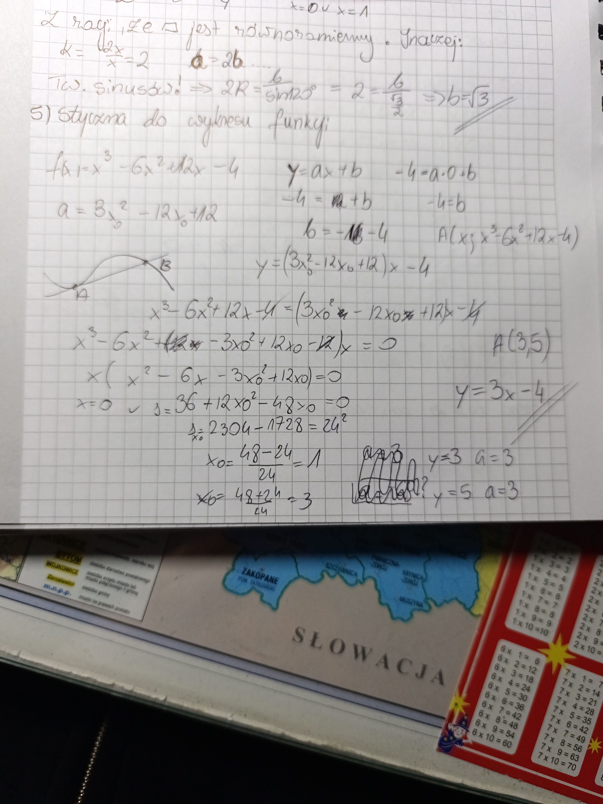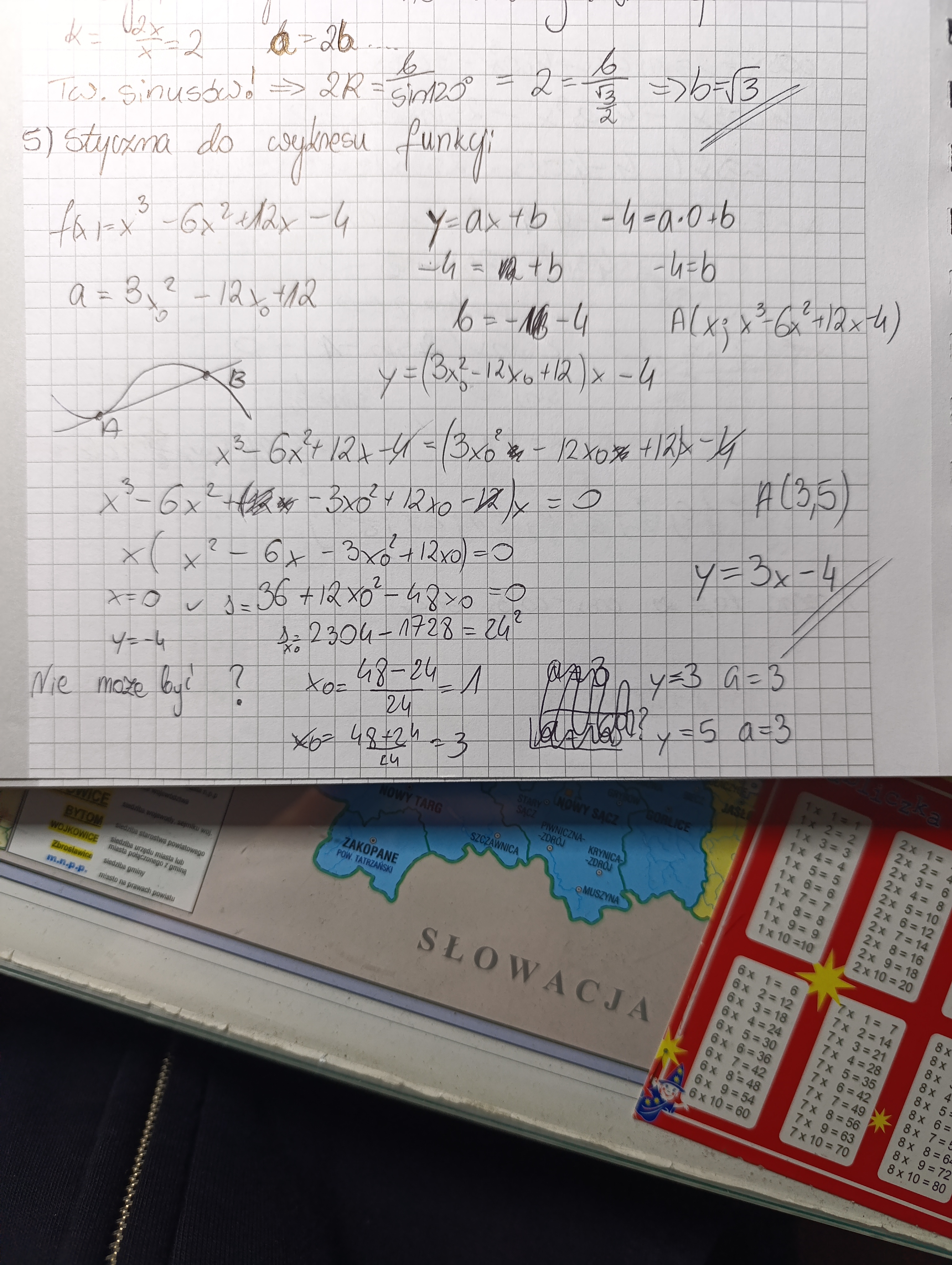 Styczna do wykresu funkcji fx x³-6x²+12x-4 w punkcie a przecina ten wykres w punkcie bo (0,-4) różnym od punktu a. Oblicz współrzędne punktu a oraz równanie stycznej