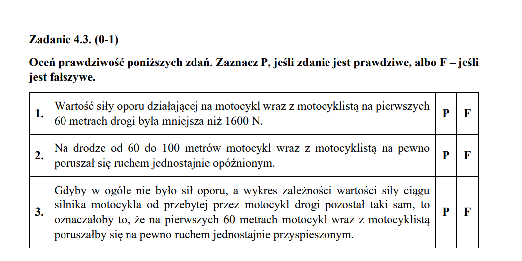 Tak, to "na pewno" jest takim słowem kluczem ;) Tu można by było sobie wyobrazić zapewne kilka scenariuszu odnośnie ruchu jakim może wtedy poruszać się taki motocykl. Najprościej jest sobie wyobrazić np. że taki motocykl porusza się pod górę (równię pochyłą). Ta równie może mieć nawet takie nachylenie, że składowa siły ciężkości działającej na motocykl równoległa do równi dokładnie będzie równoważyła siłę ciągu silnika - wówczas faktycznie nie będzie oporów ruchu, a ruch motocykla będzie jednostajny, a nie jednostajnie przyspieszony (przy większym nachyleniu będzie nawet jednostajnie opóźniony).