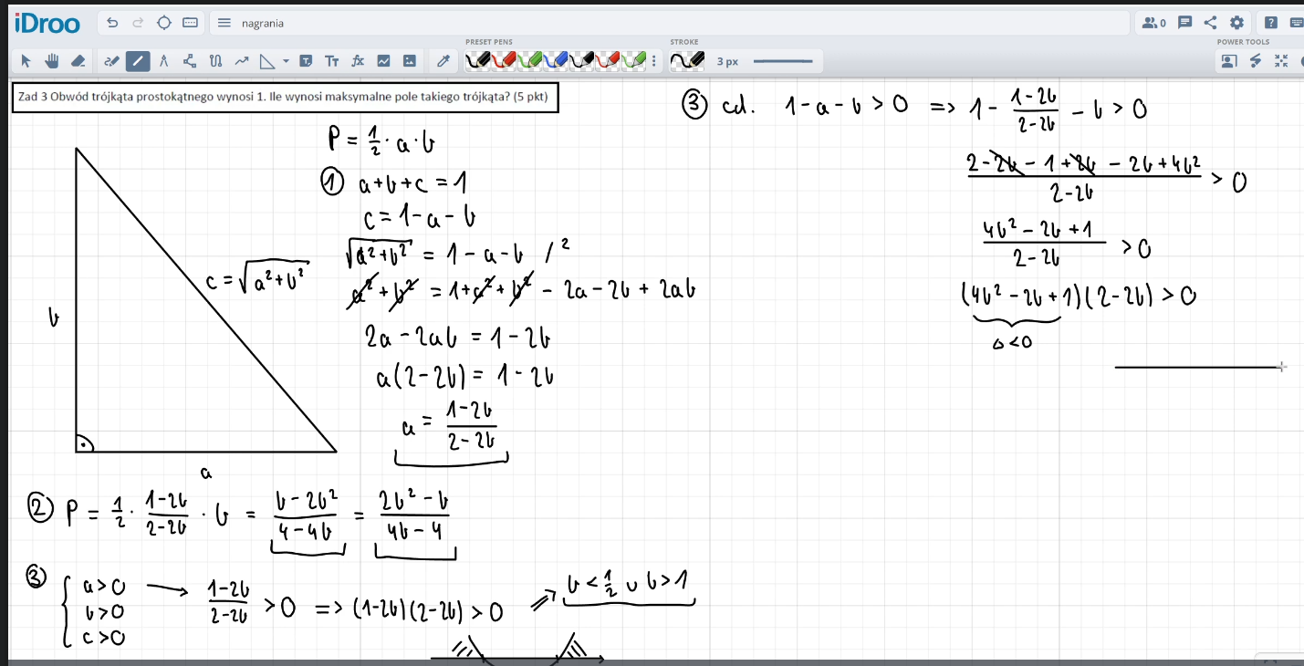 czy warunki a,b,c >0 są w tym przypadku wystarczające? Pytam, bo robiłem ostatnio zadanie maturalne (bodaj 2019.c.15?) w którym jak napisało się tylko, że odcinki są większe od 0 to dziedzina nie zgadzała się z kryteriami i wychodziła poprawna dopiero bo napisaniu nierówności trójkąta (a + b > c)