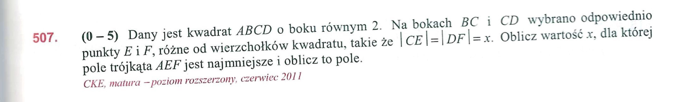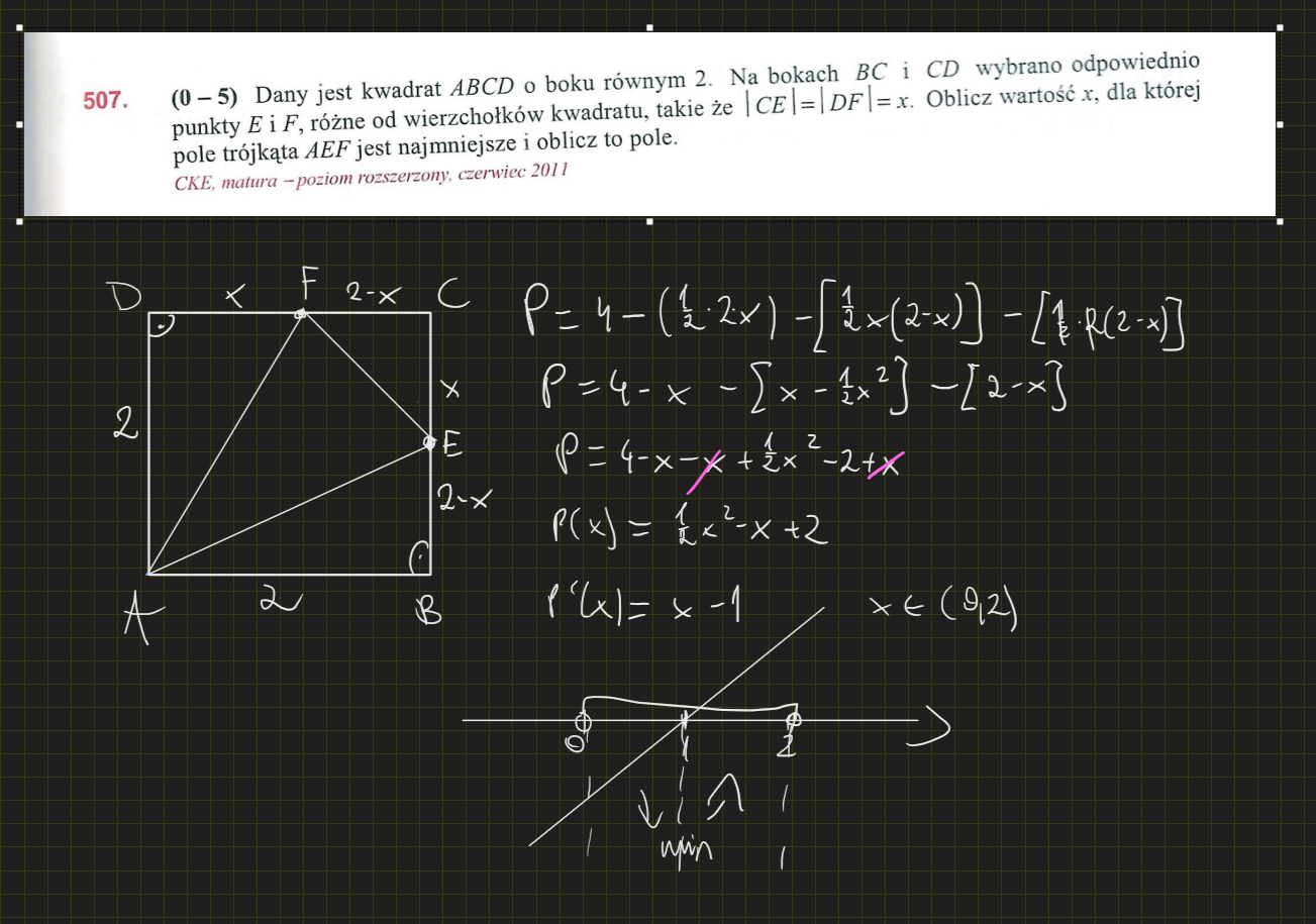 Dlaczego w odpowiedziach dziedzina jest domknięta ostro? Wtedy zakladamy opcje w której nie wychodzi trójkąt, poza tym z treści wiemy, że punkty E i F nie mogą być wierzchołkami.