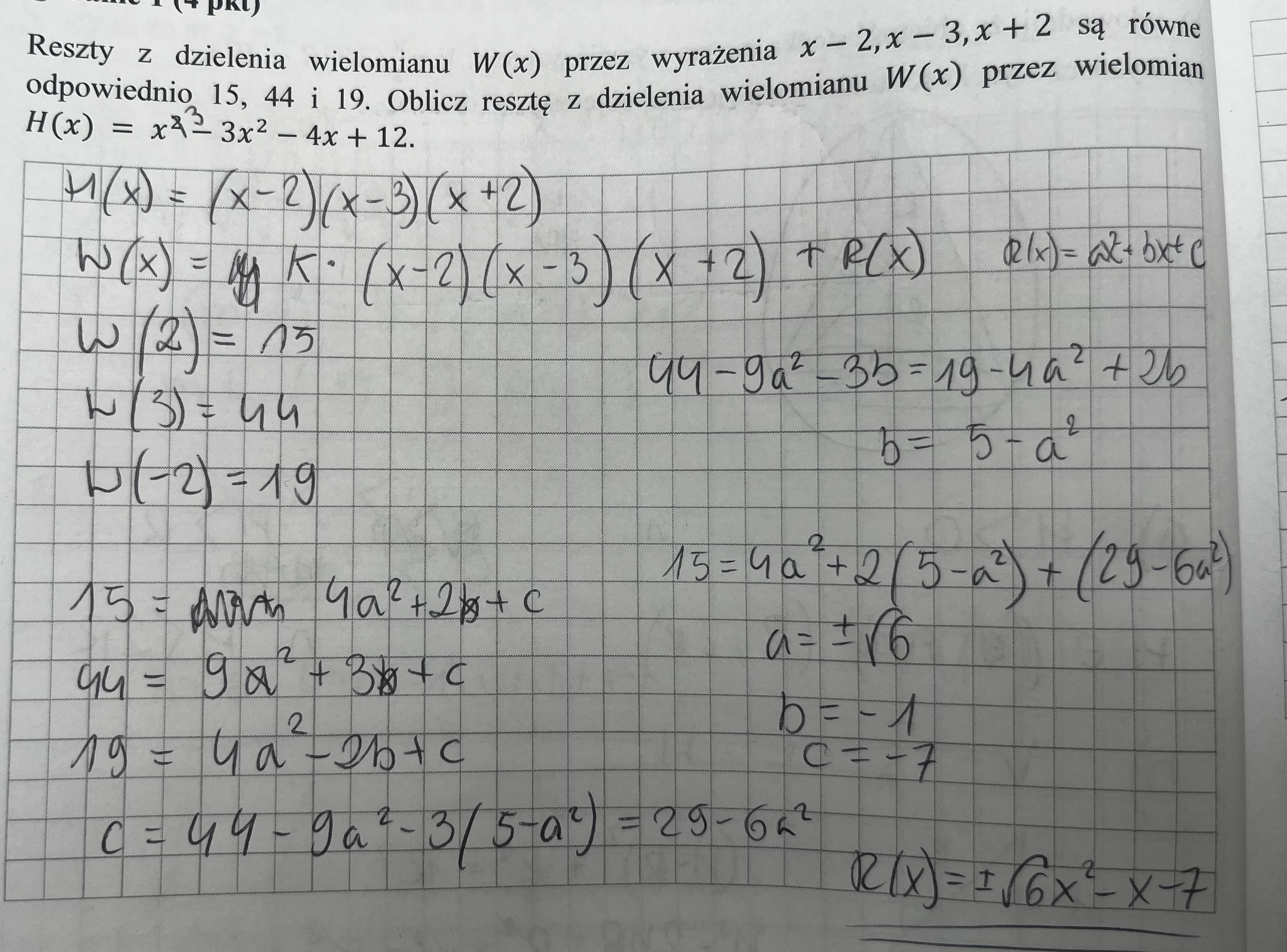 Wzór na resztę to ax² + bx + c czyli tak jak napisałaś u góry. Natomiast potem zaczęłaś liczyć dla a² dlatego źle ci wychodzi.