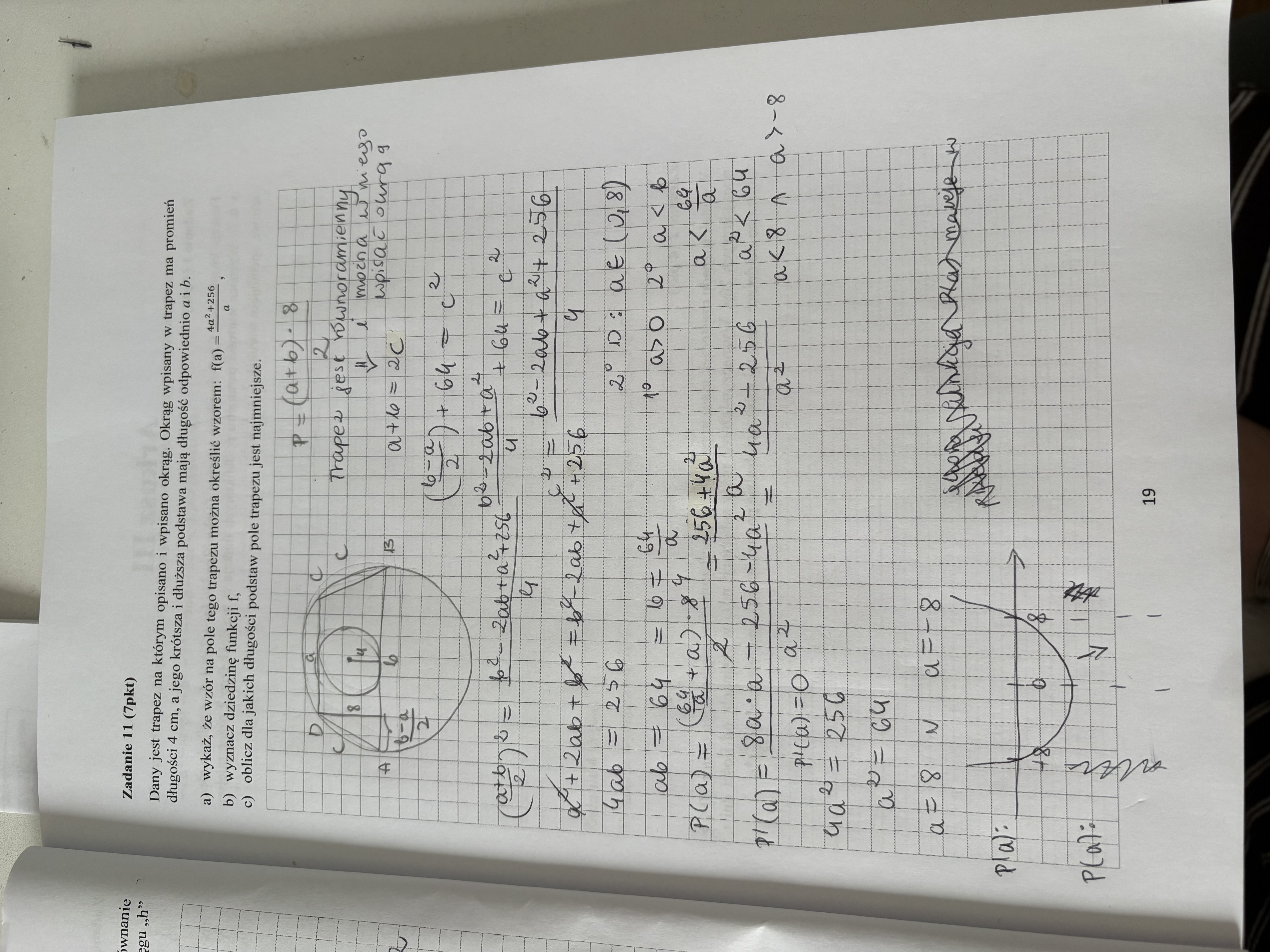 hej czy ktos moze mi wytlumaczyc dlaczego włączamy 8 do dziedziny skoro jest napisane w poleceniu ze jedna podstawa jest krotsza a druga dluzsza? jesli nie wlaczamy 8 do dziedziny to miejsca zerowe pochodnej się z nie pokrywaja z dziedzina wiec nie wiem jak to rozwiazac