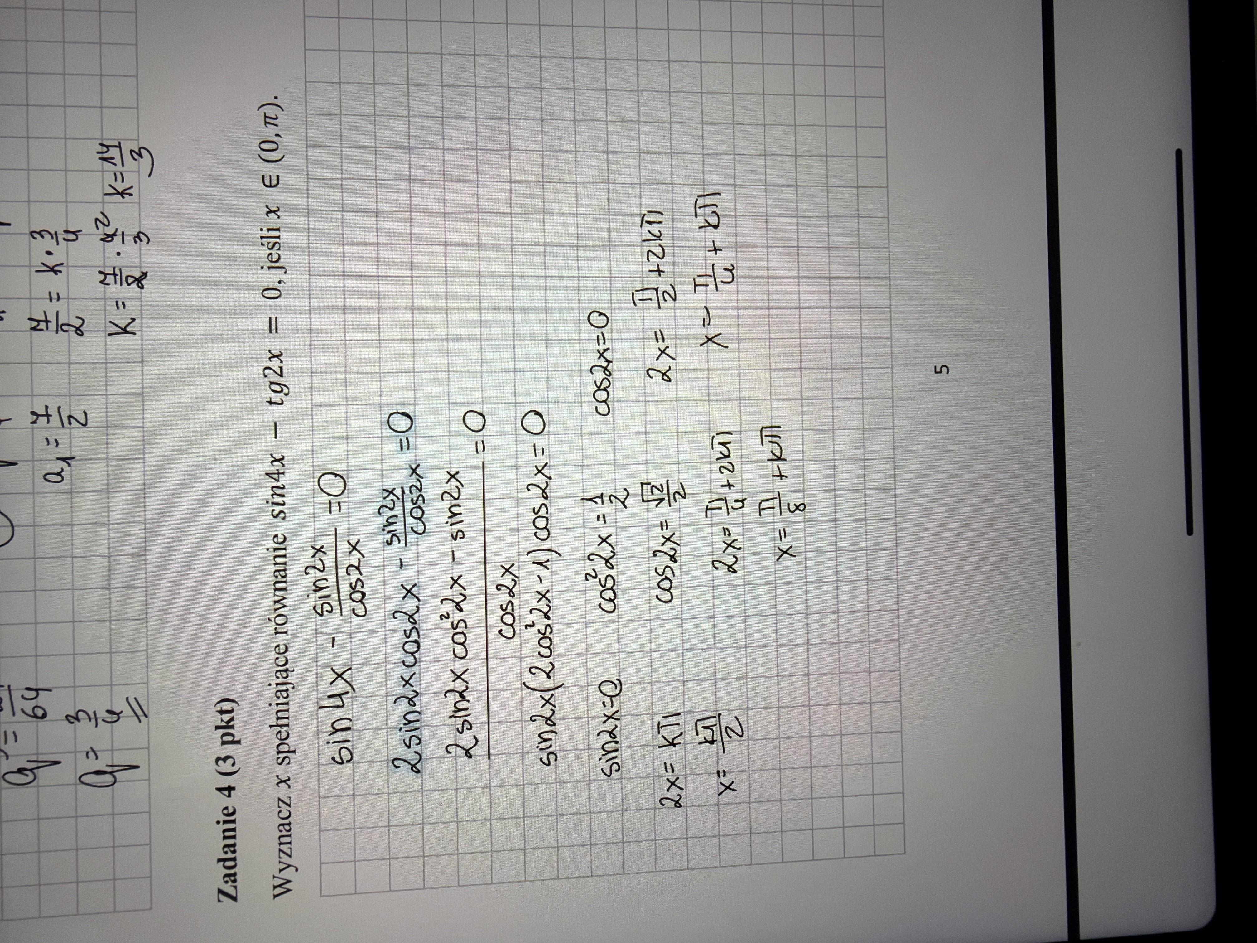 Zawsze jak masz równanie z tgx musisz na początku wyznaczyć dziedzinę która jest równoznaczna że daje cosx różne od zera z tym przypadku akurat cos2x. Zresztą za to masz nawet punkty w kryteriach. Więc musisz wywalić to rozwiązanie cos2x=0 bo wtedy równanie jest nieokreślone. Polecam taki nawyk że jak widzisz równanie z tgx od razu bez zastanowienia wyznaczasz dziedzine zresztą za to jest nawet punkt w kryteriach.
