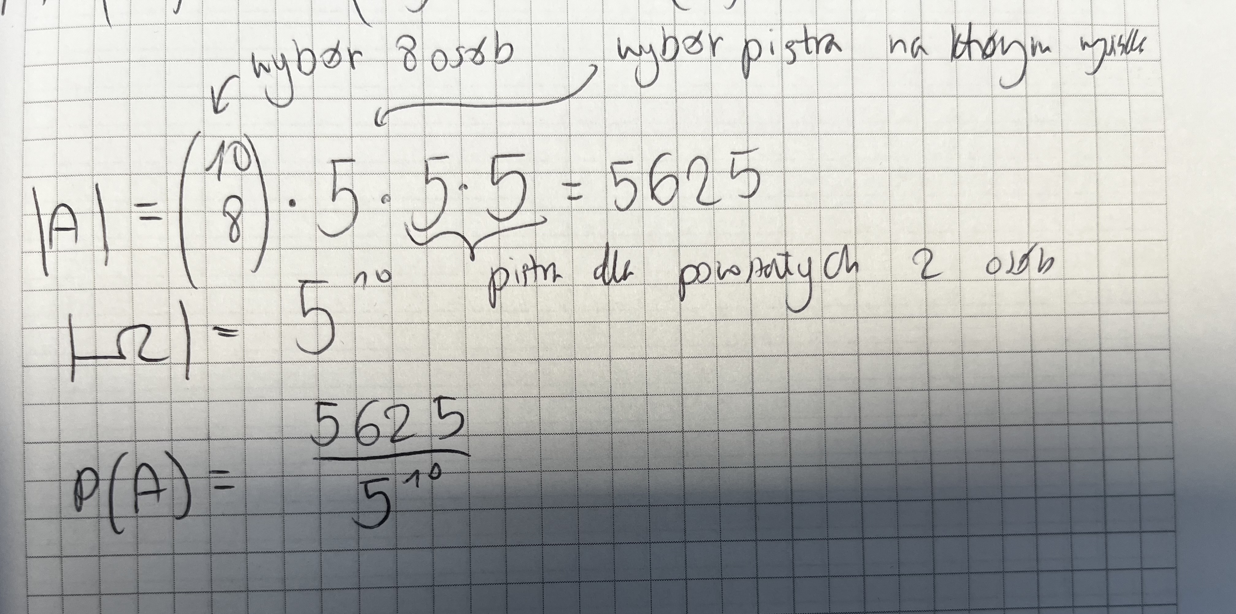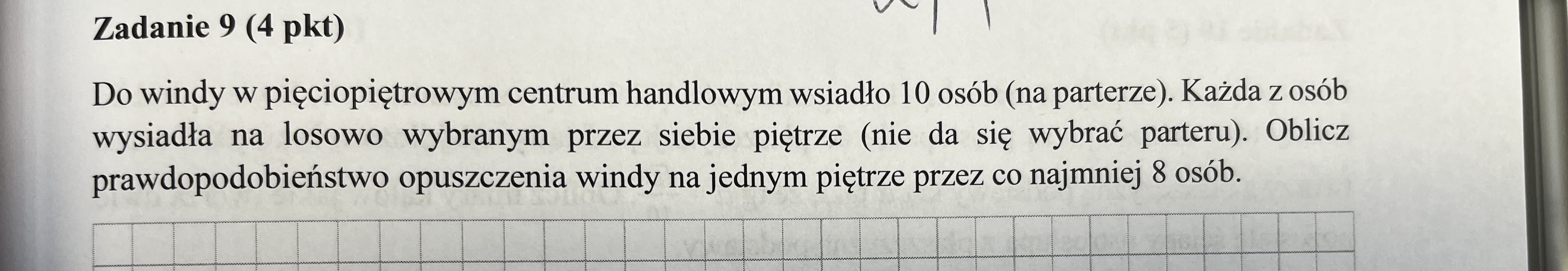 Twoje rozwiązania się nakładają popatrz że jak bierzesz tam 10 po 8 to daje nam rozmieszczenie tych osób które muszą być i patrz rysunek różowe kropki to tam jak on ci by to rozmieścił ja dałem cztery zeby było czytelniej i zobacz pierwszy i ostatni przypadek że jak tam podstawisz to samo piętro co różowe to będzie to samo i to jest ten przypadek który się powtarza dlatego musisz to rozpisać na oddzielnie ile osób idzie na początku 8 potem 9 i wszyscy i to sumować bo twoje rozwiązanie się nakłada na siebie.