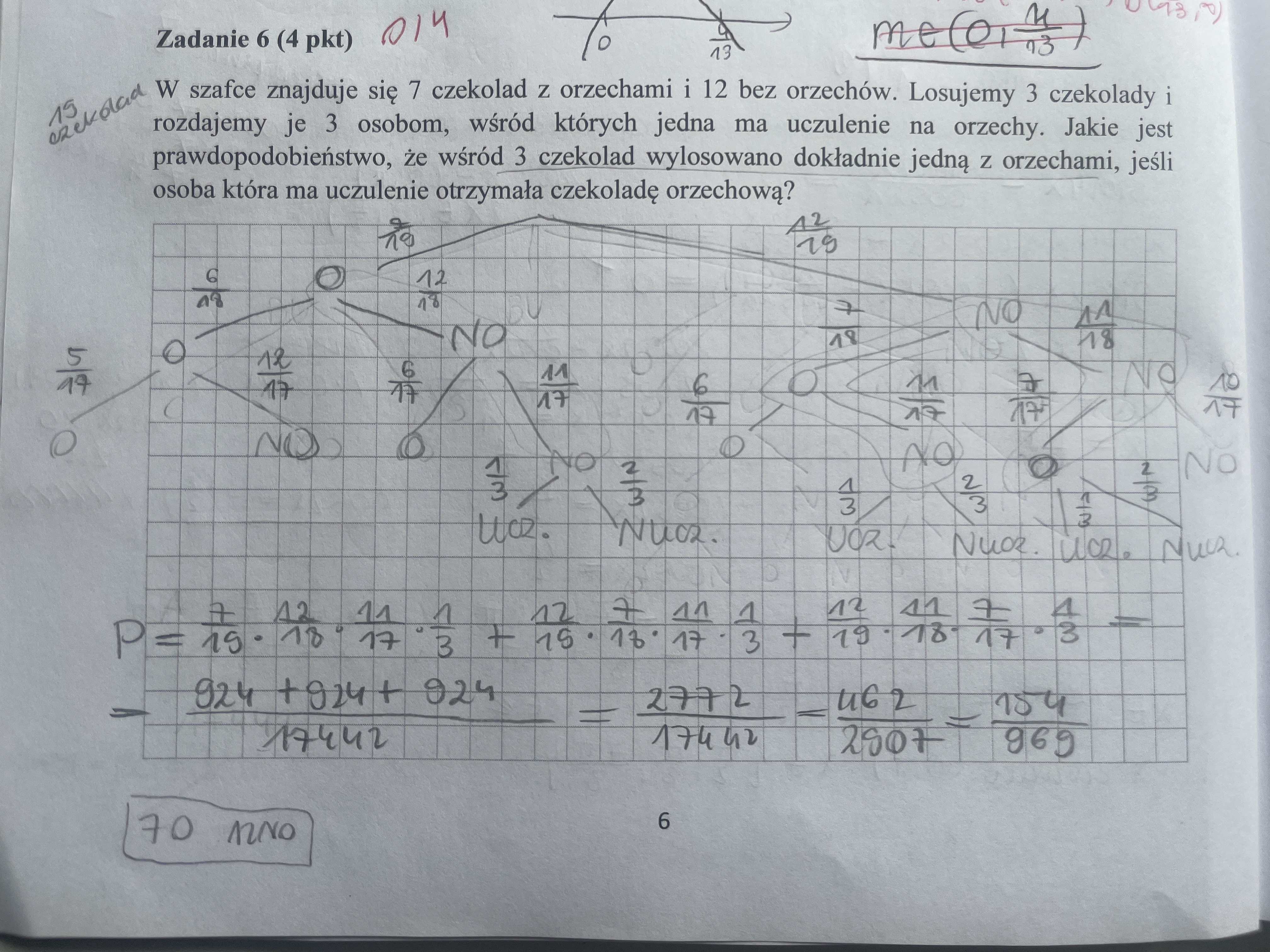 Wykonałam to zadanie niepoprawnie, ale zastanawiam sie, dlaczego nie mógłby wyjsc wynik tym sposobem, czyli po prostu z drzewka. Rozpisałam sobie kolejno wszystkie rozgałęzienia, gdzie O- to czekolada z orzechami a NO to bez orzechów. Na samym końcu rozgałęzienia to ucz to czyli osoba uczulona i nucz. czyli nie uczulona. Wydawało mi sie, że powinno wyjść tym sposobem skoro zliczam wszystkie przypadki, w których wylosowano jedną czekoladę z orzechami i osobą uczulona dostała te czekolady. Czy mógłby ktoś wytłumaczyć mi błąd w moim rozumowaniu?