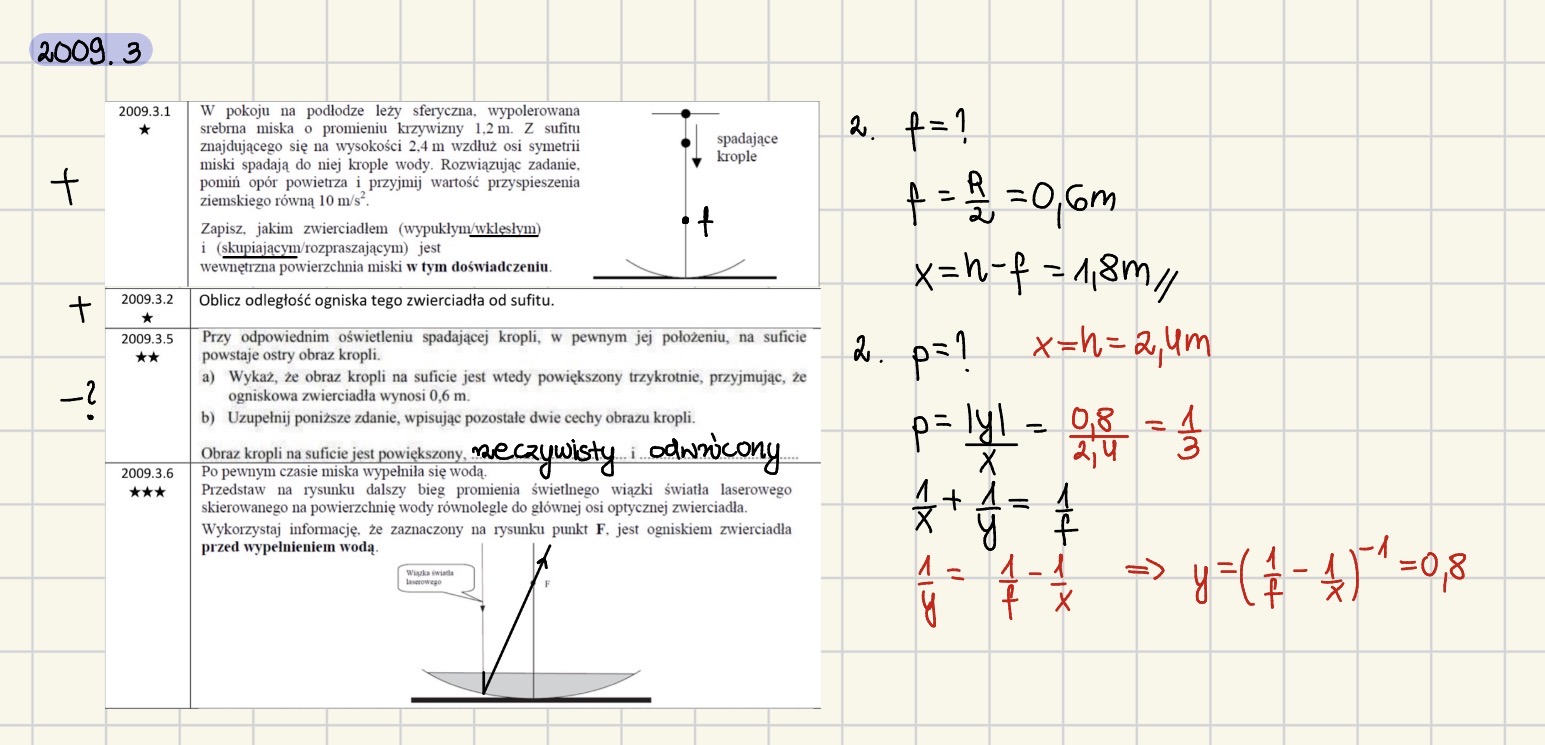 Wygląda na to, że potraktowałaś y jako x, a x jako y. Przypominam, że x to odległość przedmiotu od zwierciadła, czyli odległość spadającej kropli od zwierciadła - i to własnie ten x musimy najpierw z równania soczewki/zwierciadła policzyć. f = 0,6 m, a to y jest właśnie równy 2,4 m, a nie x. Jest tak, ponieważ zgodnie z treścią na suficie obserwujemy obraz kropli, a y to właśnie odległość obrazu od zwierciadła, więc y = 2,4 m. I jeśli tak jest to wyjdzie Ci z równania zwierciadła, że x = 0,8 m, a zatem powiększenie faktycznie jest równe 3.