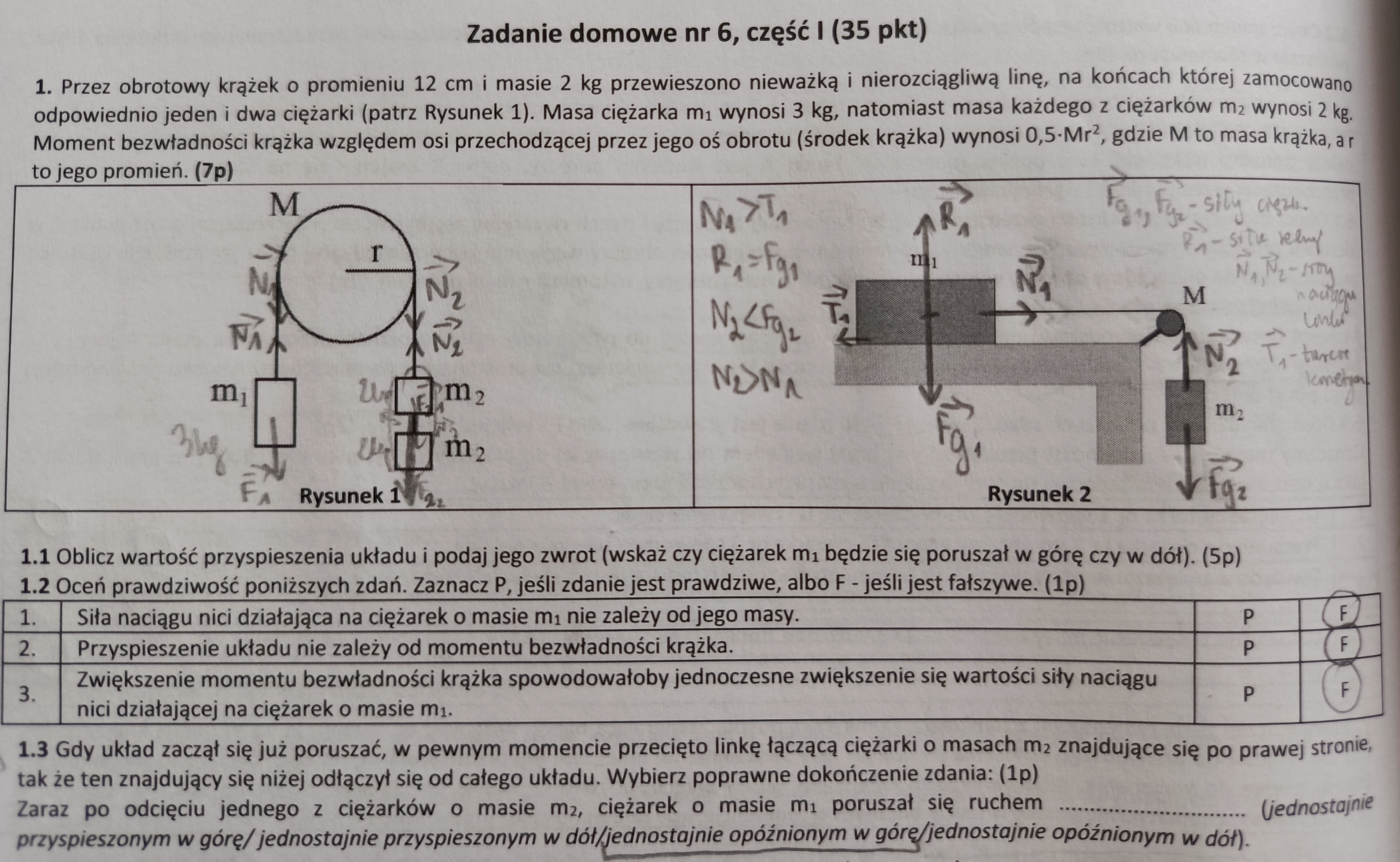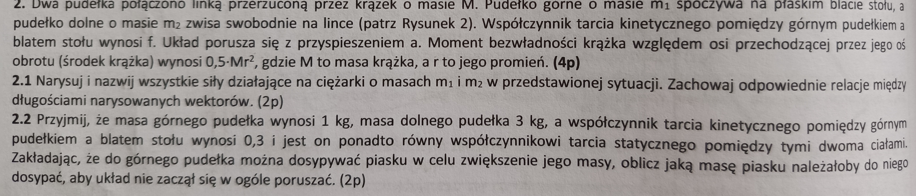 Zad. 1: Można je osobno dorysowywać, ale w kontekście rozwiązania tego zadania w istocie nie jest to po prostu potrzebne, bo faktycznie możemy przyjąć, że ten układ dwóch ciężarków po prawej stronie jako właśnie jeden "układ" i wtedy te siły naciągu będą siłami wewnętrznymi tego układu, więc nie ma potrzeby ich rozpatrywać w kontekście zachowania całości (ciężarek po lewej - krążek - dwa ciężarki po prawej). I tak, można zatem te dwa ciężarki po prawej potraktować jako "jedno" ciało i wtedy N2 powinno być przyłożone do górnego ciężarka (najlepiej blisko jego "styku" z linką, ale w kontekście maturalnym nie ma to aż tak dużego znaczenia). Siła ciężkości w teorii powinna być wówczas narysowana w środku masy tych dwóch połączonych ciężarków, więc tak na dobrą sprawę dokładnie między nimi (ale na maturze pewnie nie będzie to miało znaczenia, albo CKE samo powie, że te siły trzeba przyłożyć do ściśle określonego punktu i nie będzie wtedy żadnych wątpliwości).