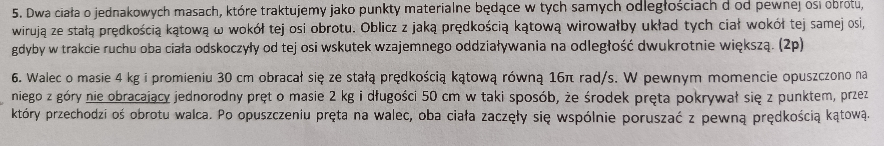 Dlaczego w zadaniu 5 moment pędu należy policzyć poprzez dodanie momentów pędów dwóch punktów materialnych, a nie np. ich odjęcie? Nie rozumiem do końca, bo przecież punkty te mogą być naprzeciwko siebie po przeciwnych stronach osi obrotu i wtedy ich prędkości liniowe będą miały przeciwne zwroty lub też punkty będą od siebie w jakiejś odległości po łuku mniejszej niż połowa okręgu i te wektory prędkości liniowych będą względem siebie pod jakimś kątem lub też punkty mogą się pokrywać.