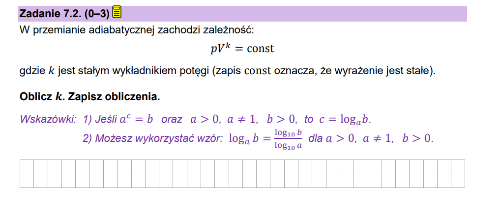 2) w odpowiedziach do tego zadania CKE nie dało przykladu rozwiązania tego zadania przy użyciu wzory k=Cp/Cv . Czy tutaj jak na matematyce musimy powiedzieć skąd się to bierze i wtedy zastosować, czy tylko zasstosować i będzie git? Czy wgl nie możemy tutaj tego użyć, z uwagi na to, że już przez same wskazówki mówią nam jak nasz tok rozumowania powinien przebiegać?