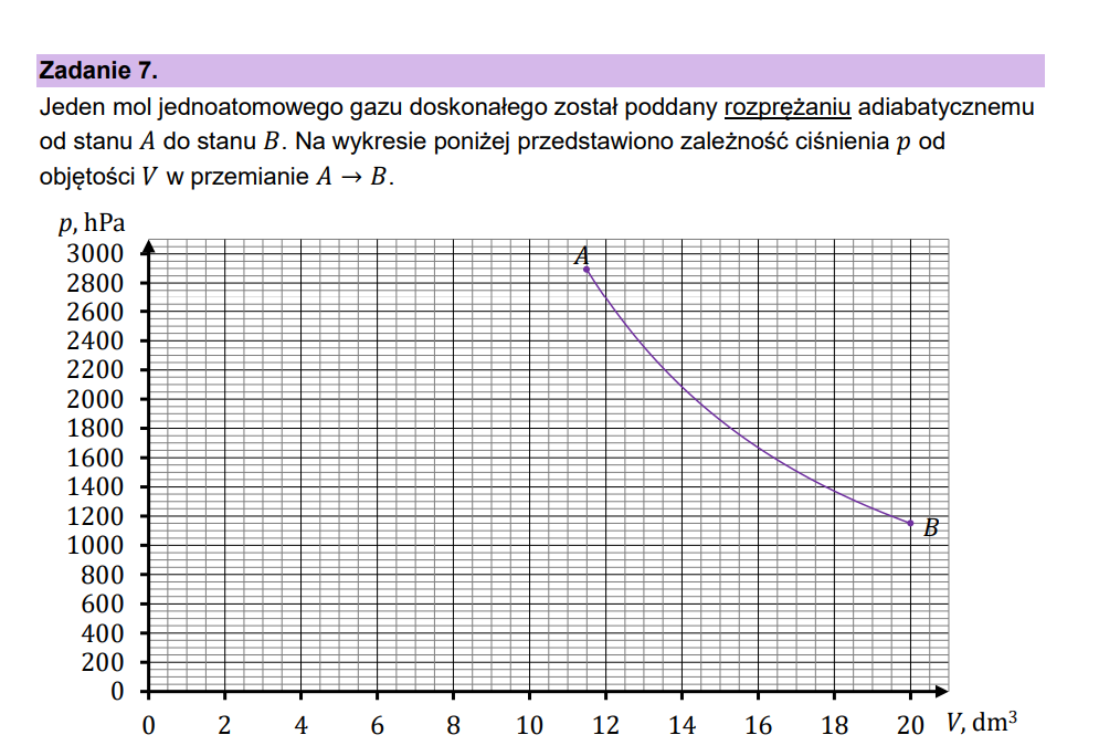 1) w zadaniu napisali informacje że pV^k = const wiec spróbowałem odjąć dane z punktu A i dane z punktu B i zobaczyć czy dobrze obliczyłem k (dobrze obliczyłem) ale wynik nie wyszedł 0. Czy jest to spowodowane niedokładnością wykresu, w sensie czy punkty nie są tutaj kratowe?