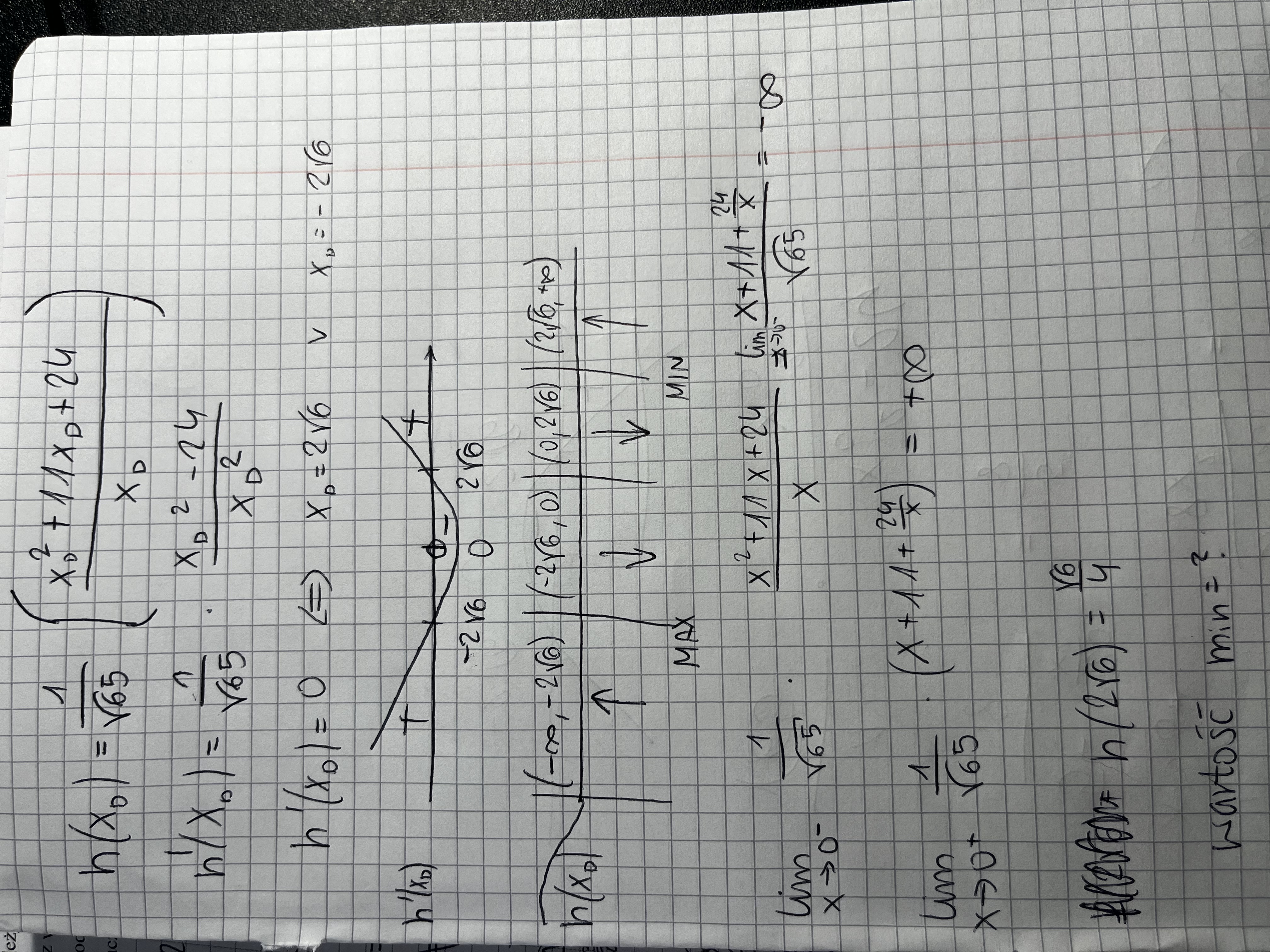 pochodna zeruje się wtedy dla +/- 2pierw z 6, ale przy rysowanie zmienności znakun pochodnej trzeba uwzględnić to że 0 nie zależy do dziedziny