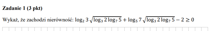 Ja to zrobiłem że wstawiłem te logarytmy pod pierwiastek i tam się trochę skraca jak to wstawisz. potem zauważyłem że mogę użyć wzór na zamianę podstawy logarytmu dokładnie że loga b = 1/logb a i jak zamieniłem po jednym logarytmie pod tymi pierwiastkami to miałem sume odwrotności która jest większa lub równa 2 c.k.d.. Jak chcesz to mogę wysłać ci całe rozwiązanie.