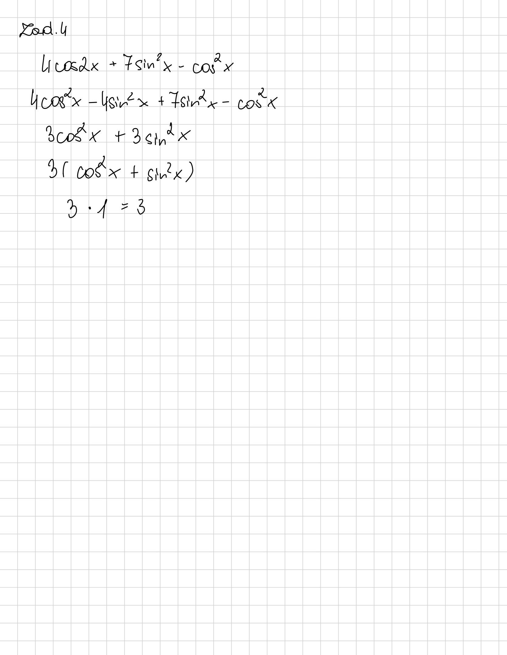 Wykaż, że wyrażenie 4cos2x + 7sin^2x - cos^2x jest równe 3 dla x należącego do R