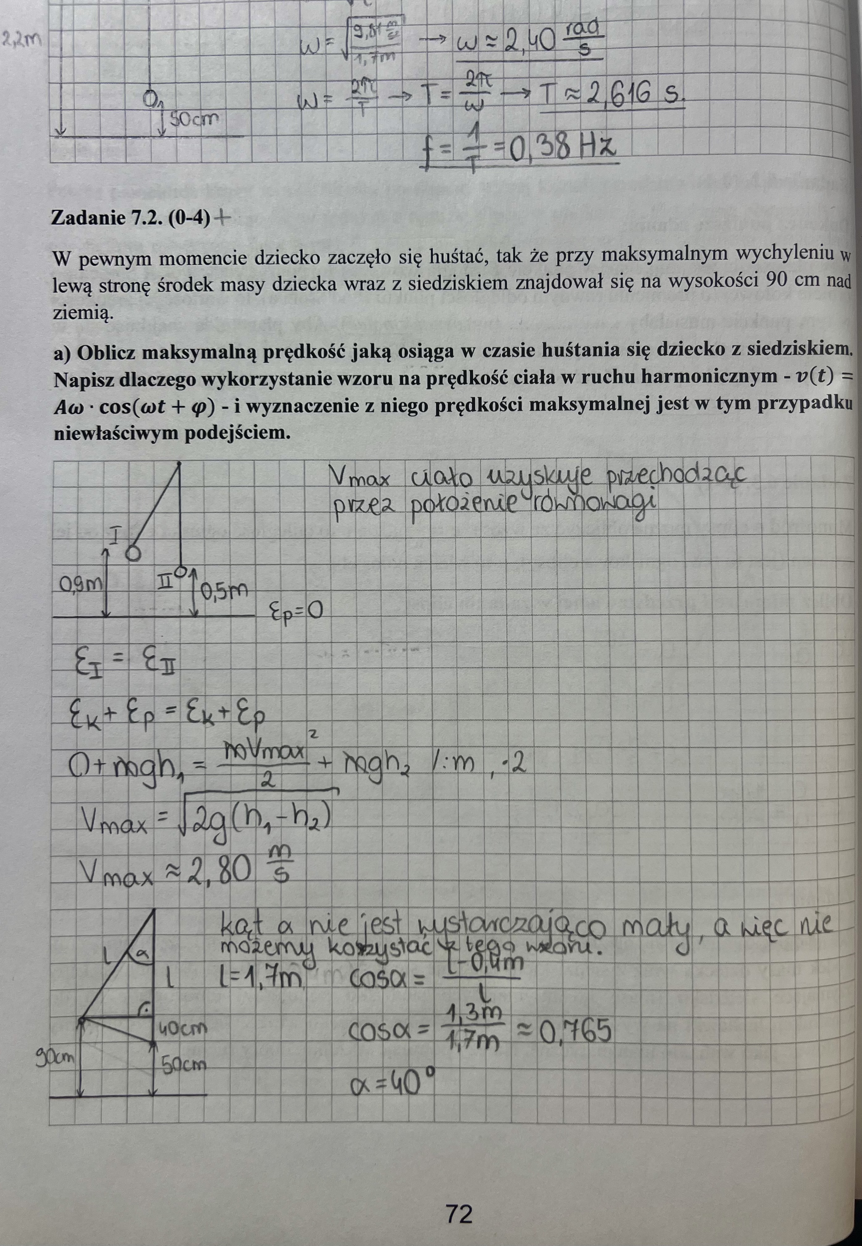 dobry wieczór, nie jestem pewna czy moja odpowiedź na to pytanie jest wystarczająca, wyznaczyłam kąt alfa, kąt między położeniem równowagi a maksymalnych wychyleniem i wyszedł mi 40*, wiem że jest on zbyt duży ponieważ z tego wzoru korzystaliśmy dla wystarczająco małych kątów np do kilku stopni, czy moje rozumowanie tłumaczy ten problem ?