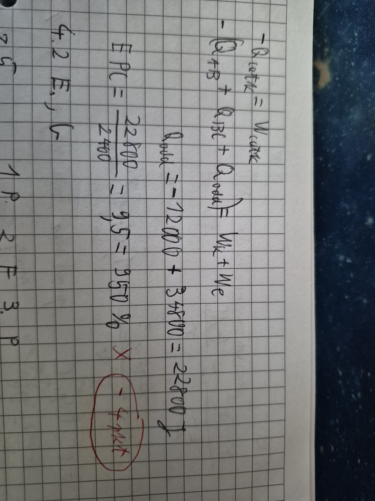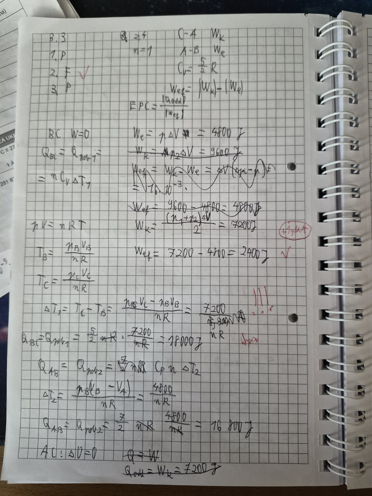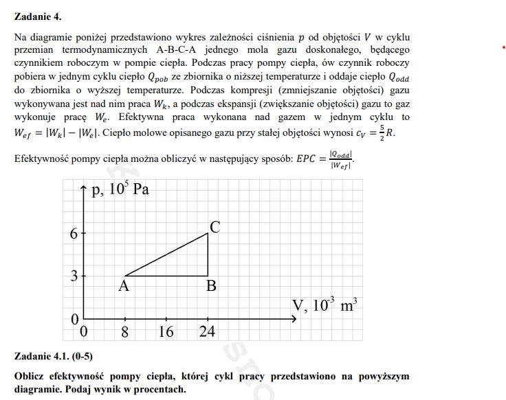 -Qcałk = Wcałk. Ale jak to ze wzorami z karty bywa trzeba wiedzieć co one dokładnie oznaczają ;) dlatego my na zajęciach zapisywaliśmy to delikatnie inaczej, ale znaczenie oczywiście jest takie samo. Mianowicie Qcałk to jest to efektywne ciepło wymienione przez gaz z otoczeniem a Wcałk to jest efektywna praca. I tutaj łatwiej jest operować na wartościach bezwzględnych (znów - tak jak to na zajęciach robiliśmy), wobecz czego dostajemy |Qcałk| = |Wcałk|, czyli |Qef| = |Wef|, czyli dla pompy ciepła będzie to |Qodd| - |Qpob| = |Wef|, a zatem |Qodd| = |Wef| + |Qpob|, gdzie |Qpob| to ciepło pobrane przez gaz w tych przemianach, w których własnie pobierał on ciepło, czyli w przemianach AB i BC, więc dostajemy |Qodd| = |Wef| + |Qab| + |Qbc|. I wtedy dostaniesz dobry wynik.