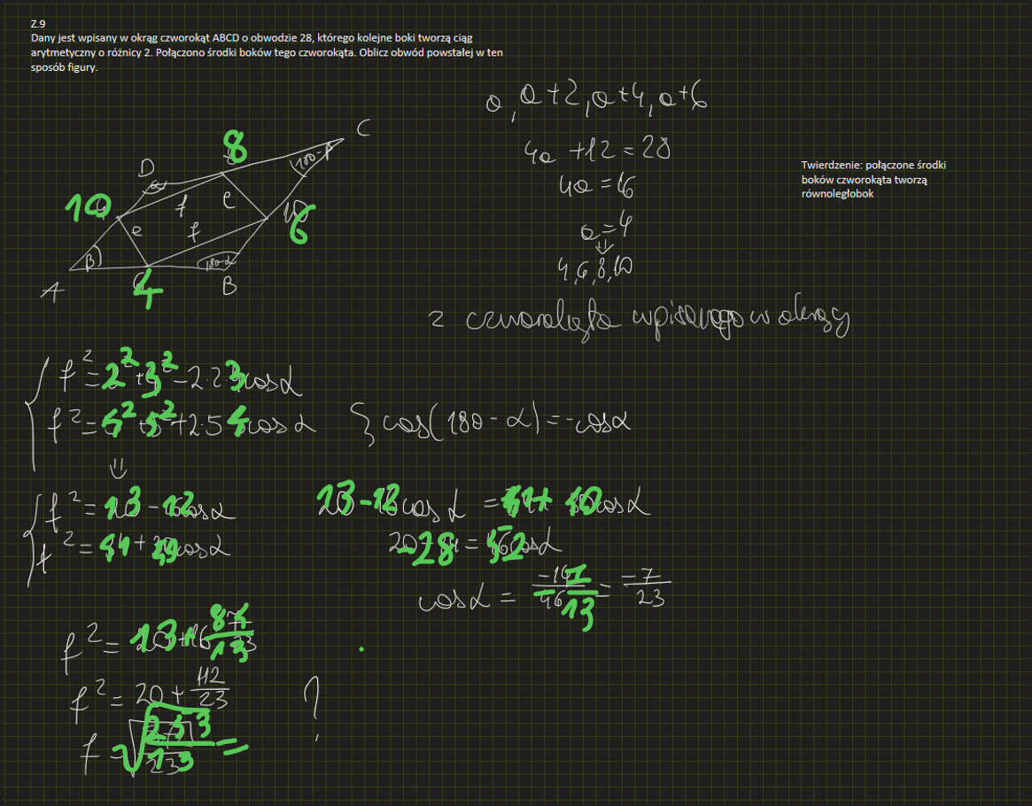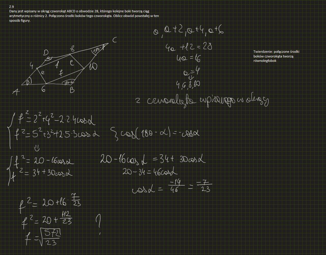 Bo kolejne boki to |AB| = 4 (u cb równe 6), |BC| = 6 (u cb 10), |CD| = 8(tu dobrze) i |DA| = 10(u cb 4) jeszcze jakbyś cyklicznie to obrócił to byś miał git ale pomieszałeś totalnie długości.